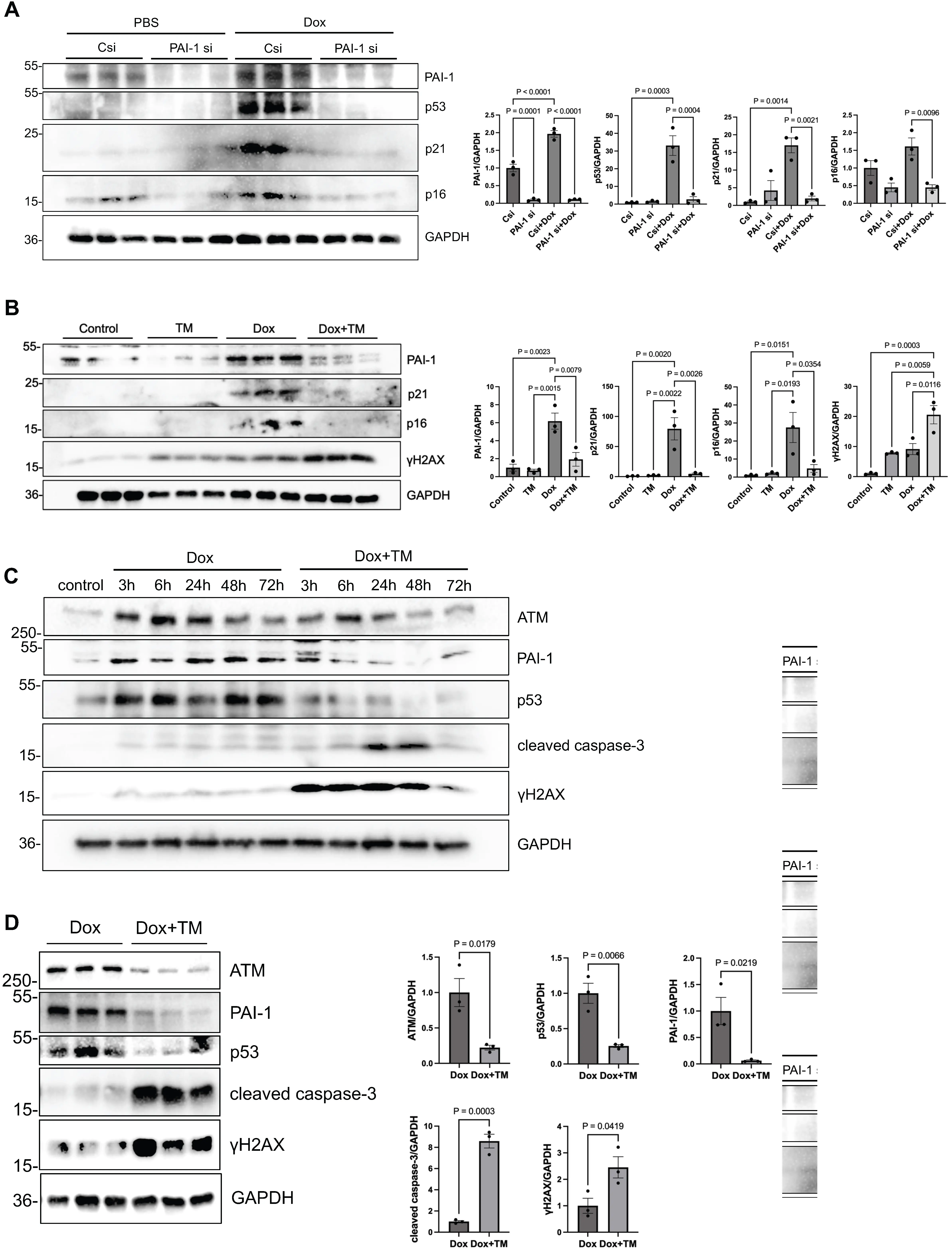 Figure 3. Doxorubicin-induced cardiomyocyte senescence involves PAI-1 and is attenuated by TM5275. (A) Left: Western blot analysis of PAI-1, p53, p21, and p16 in NRVMs treated with PBS (control), Csi, or PAI-1 si, with or without Dox (100 nM). Right: Quantification of band intensity for each protein; (B) NRVMs were treated with Dox (100 nM) and/or TM5275 (25 μM) for 72 hours. Left: Western blot analysis of PAI-1, p21, p16, and γH2AX in NRVMs treated with vehicle (control), TM5275, Dox, or Dox + TM5275.