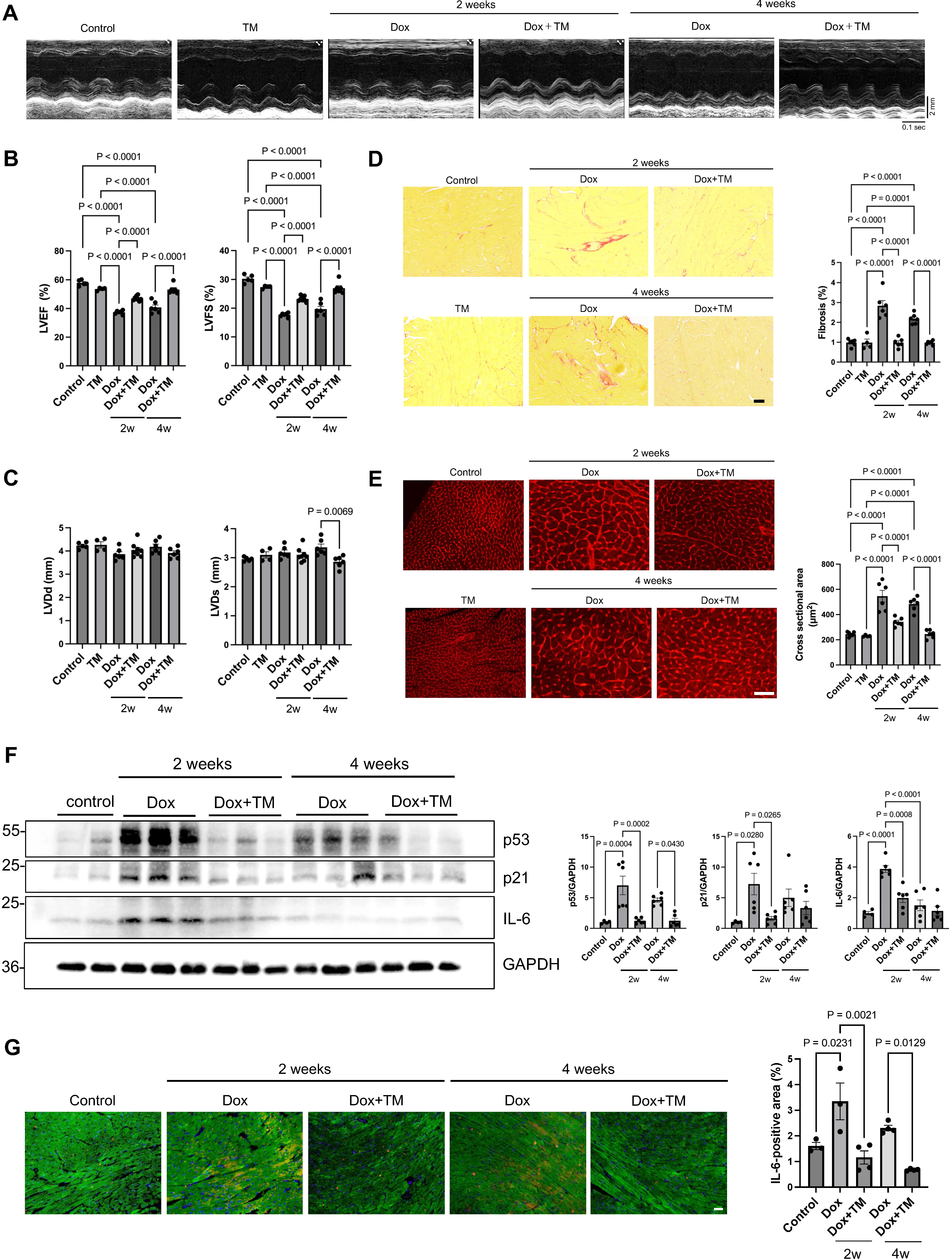 Figure 4. TM5275 improves cardiac function and reduces senescence- and stress-related markers in a mouse model of doxorubicin-induced cardiotoxicity. Wild-type mice were treated with Dox in the presence or absence of TM5275. Dox was injected two times, at weeks 0 and 1 (i.p. injection, 5 mg/kg), in either the presence or absence of TM5275 for 2 weeks (10 mg/kg orally). One group of mice was sacrificed at 2 weeks to evaluate the effect of Dox and TM5275 in the acute phase and another group of mice was sacrificed at 4 weeks to evaluate the chronic effect. (A) Representative M-mode echocardiographic images from control, TM5275, Dox, and Dox + TM5275 mice at