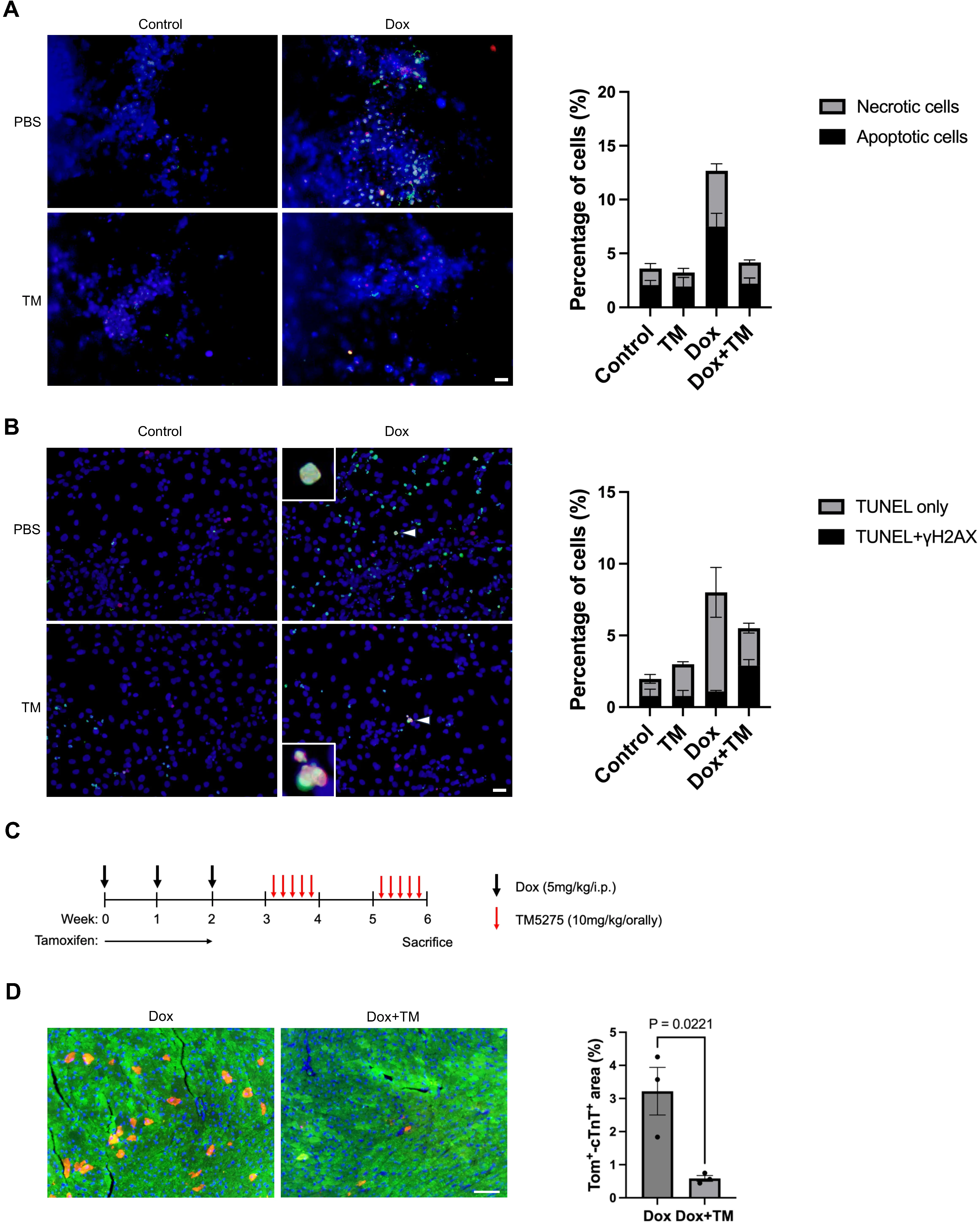 Figure 5. PAI-1 inhibition promotes apoptosis and clearance of senescent cardiomyocytes after exposure to doxorubicin. (A) NRVMs were treated with Dox (100 nM) and/or TM5275 (10 μM) for 3 hours. Left: Representative images of live/dead cell staining showing healthy cells (blue), apoptotic cells (green), and necrotic cells (red) in NRVMs treated with vehicle (control), TM5275, Dox, or Dox + TM5275. Scale bar = 100 μm. Right: Quantification of the proportions of healthy, apoptotic, and necrotic cells in each group; (B) NRVMs were treated with Dox (100 nM) and/or TM5275 (10 μM) for 3 hours. Left: Representative immunofluorescence images of TUNEL (green), γH2AX (red), and DAPI (blue) staining in NRVMs treated with vehicle (control), TM5275, Dox, and Dox + TM5275. Right: Quantification of TUNEL-positive only and double-positive (TUNEL and