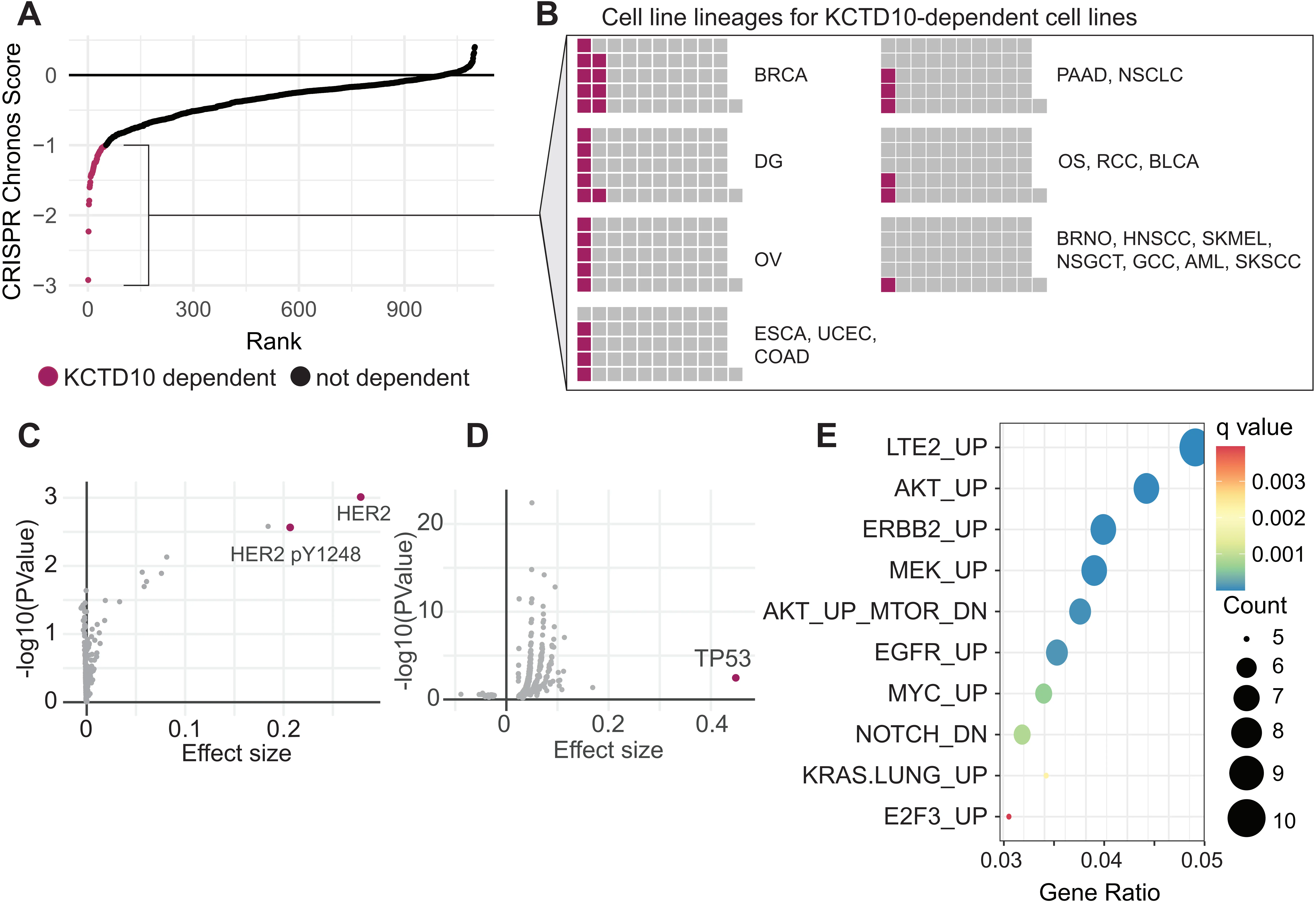 Figure 1. Characterization of KCTD10 dependency across human cancer cell lines. (A) CRISPR dependency scores for KCTD10. Cell lines with a Chronos score < -1 are considered dependent (magenta); (B) Cell line lineages for KCTD10-dependent cell lines. Multiple listed cancers indicate the same proportion for each of the cancers; (C) Enriched proteins in KCTD10-dependent cancer cell lines relative to all other cancer cell lines; (D) Enriched damaging mutations in KCTD10-dependent cancer cell lines relative to all other cancer cell lines; (E) Gene set enrichment analysis of oncogenic pathways in upregulated genes among TCGA samples that share a transcriptional profile with KCTD10-dependent cell lines using Celligner[8]. BRCA: breast invasive carcinoma; DG: diffuse glioma; OV: ovarian epithelial tumor; ESCA: esophageal squamous cell carcinoma; UCEC: uterine corpus endometrial carcinoma; COAD: colon adenocarcinoma; PAAD: pancreatic adenocarcinoma; NSCLC: non-small cell lung cancer; OS: osteosarcoma; RCC: renal cell carcinoma; BLCA: bladder carcinoma; BRNO: breast neoplasm, not otherwise specified; HNSCC: head and neck squamous cell carcinoma; SKMEL: melanoma; NSGCT: non-seminominous germ cell tumor; GCC: glassy cell carcinoma; AML: acute myeloid leukemia; SKSCC: cutaneous squamous cell carcinoma.