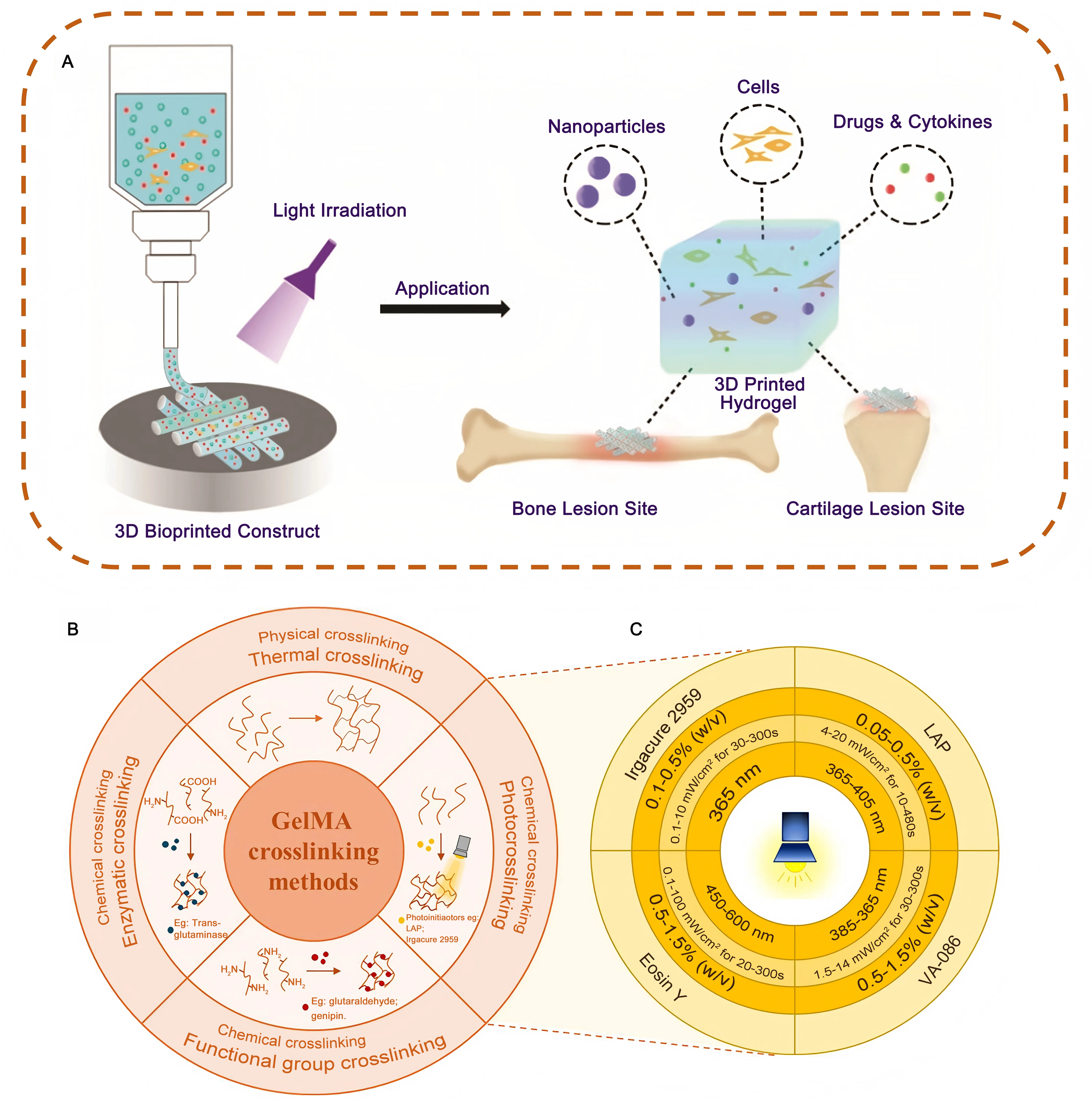 Figure 1. (A) Schematic illustration of photo-crosslinkable hydrogels for bioprinting bone and cartilage tissues[3]; (B) GelMA primary crosslinking methods; (C) Main photoinitiators employed for GelMA photocrosslinking[4]. GelMA: gelatin methacrylate; LAP: lithium phenyl-2,4,6-trimethylbenzoylphosphinate.