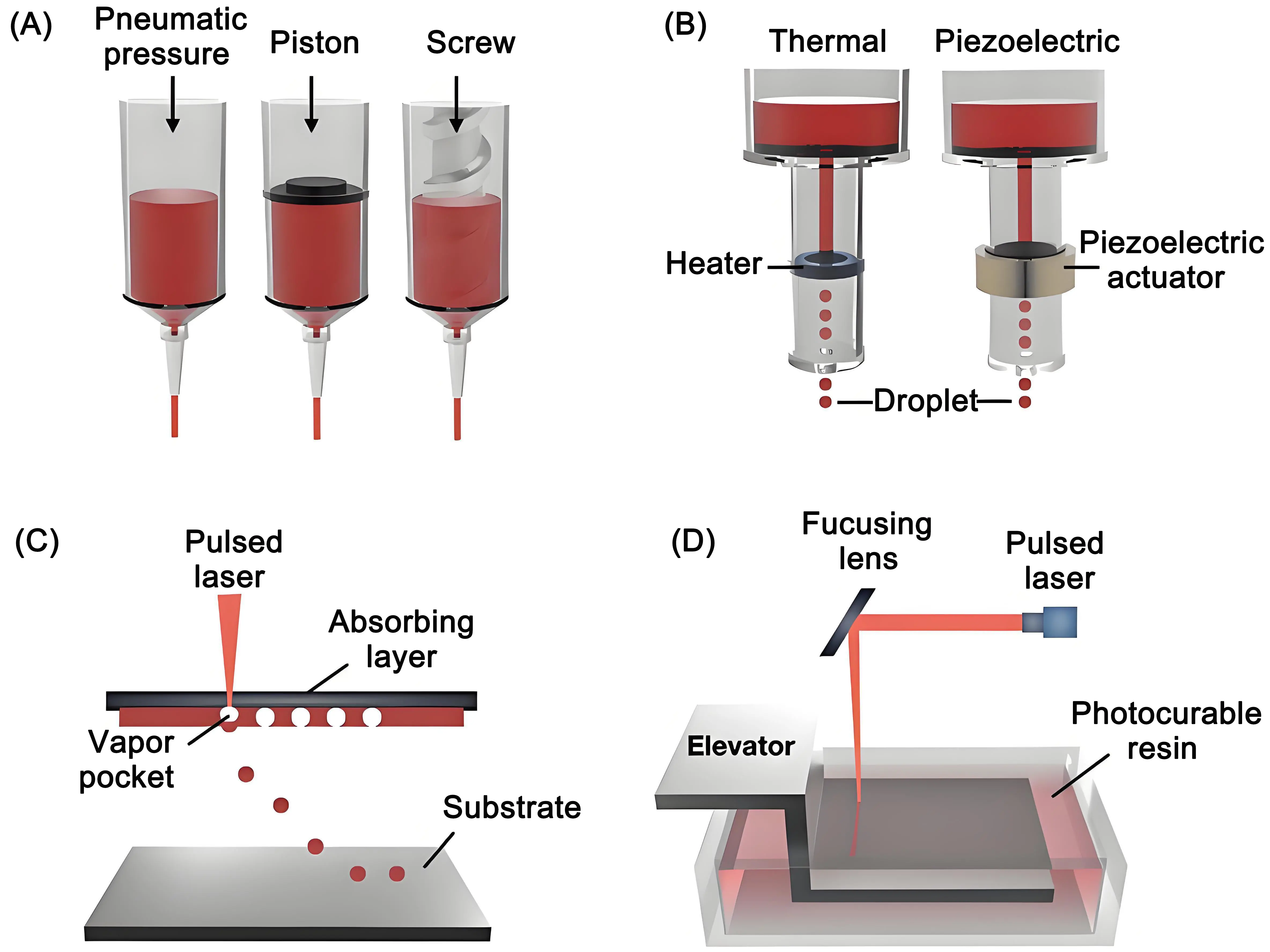Figure 2. Schematic illustration of bioprinting methods used in bone tissue engineering. (a) Bioprinting based on extrusion; (b) Bioprinting relying on inkjet, (c) Bioprinting assisted by laser; (d) Light-mediated (stereolithography) 3D bioprinting systems[21].
