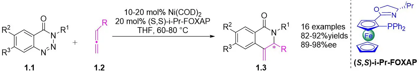 In 2009, Murakami and colleagues published a study on the denitrogenation of 1,2,3-benzotriazinones 1.1 using alkenes 1.2, resulting in the formation of substituted 3,4-dihydroisoquinoline-1(2H)-ones 1.3 with specific regioselectivity and enantioselectivity patterns (Figure 1)[29]. The selection of ligands played a crucial role in shaping the reaction outcomes. Chiral bidentate hydrogen phosphate ligand was adopted to carry out the reaction of the obtained product with high enantioselectivity. Although (R,R)-Me-DuPhos and (S,S,R,R)-TangPhos showed reasonable enantioselectivity, their regioselectivity was insufficient. Conversely, the use of (S,S)-i-Pr-FOXAP improved both regioselectivity and enantioselectivity to desirable levels, facilitating the incorporation of various functional groups in the reaction.