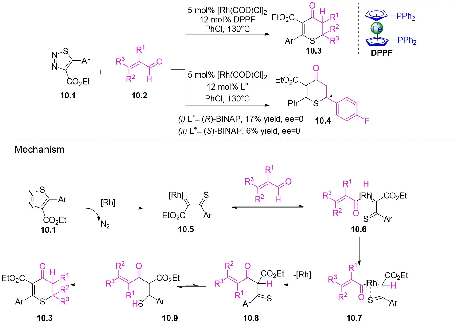 Figure 10. [3+3] transannulation of 1,2,3-thiadiazoles 10.1 with alk-2-enals. DPPF: 1,1’-bis(diphenylphosphino)ferrocene; BINAP: 2,2’-bis(diphenylphosphino)-1,1’-binaphthyl.