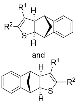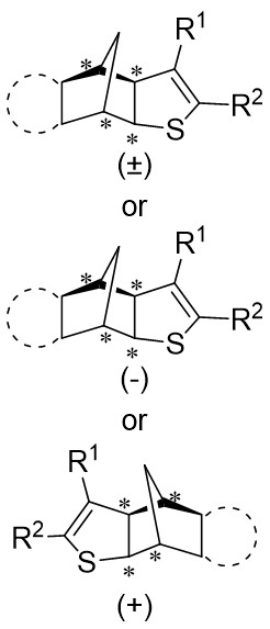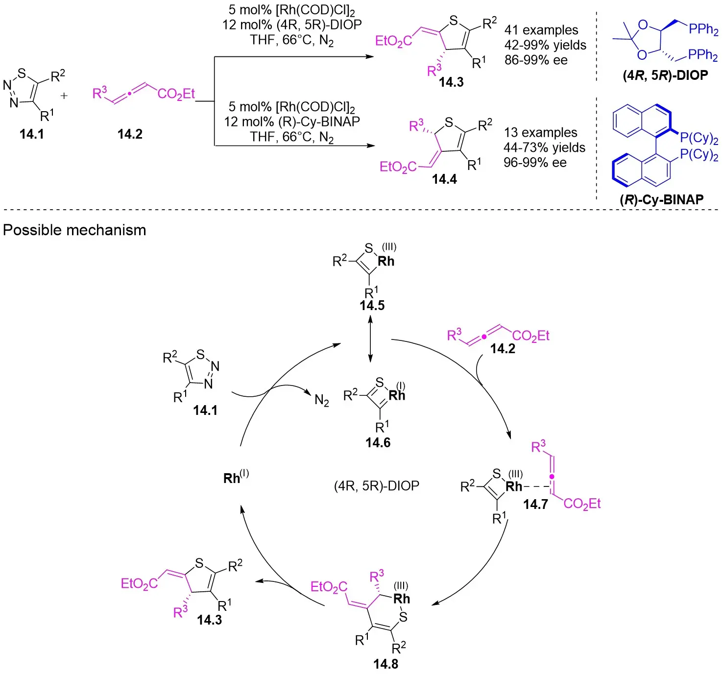 Figure 14. Transformations of 1,2,3-thiadiazoles 14.1 to alkylidene dihydrothiophenes. DIOP: (4R,5R)-2,2-dimethyl-1,3-dioxolane-4,5-diyl)bis(diphenylphosphine); BINAP: 2,2’-bis(diphenylphosphino)-1,1’-binaphthyl; THF: tetrahydrofuran.