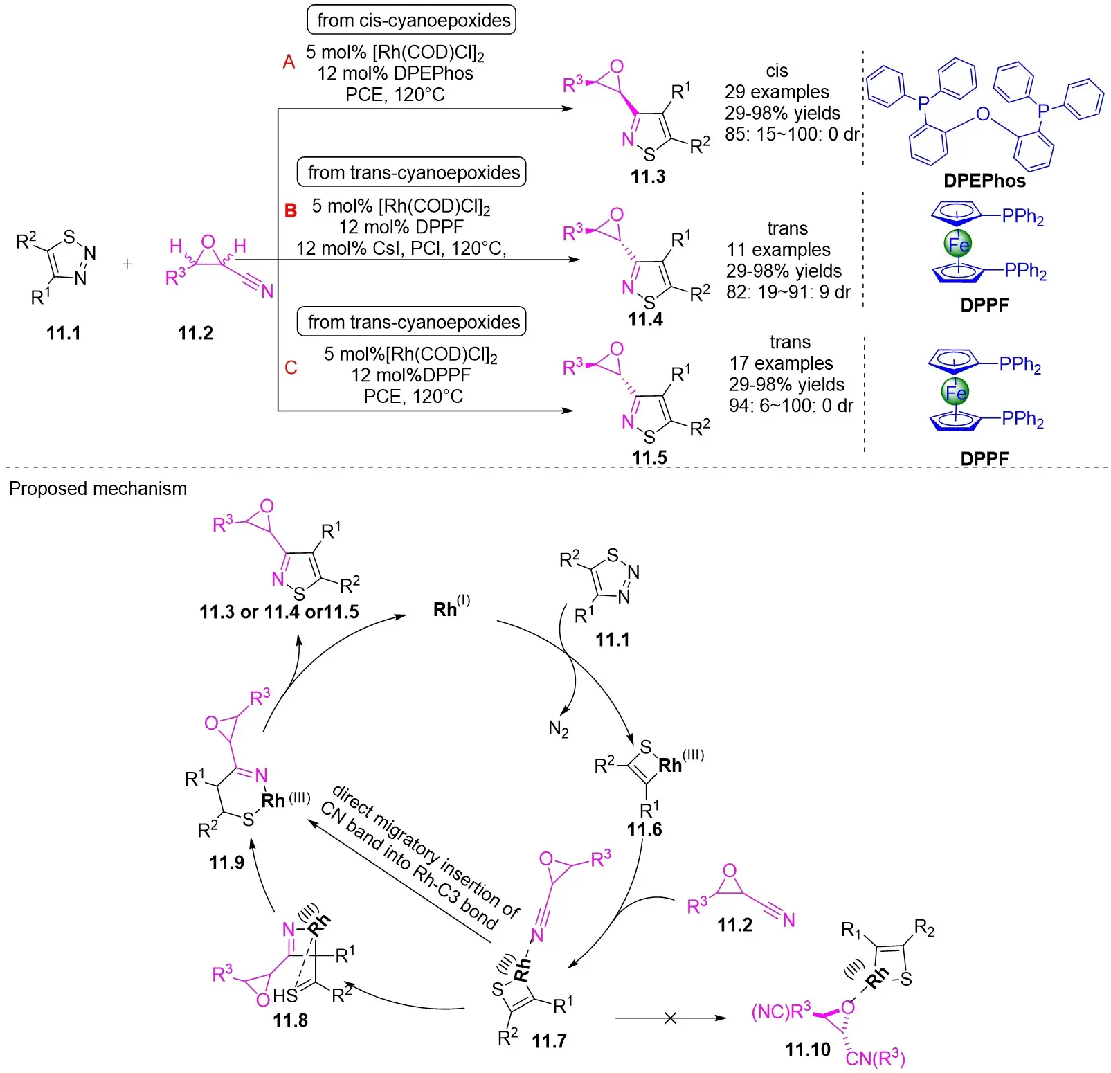 In the same year, the Yang team published on the Rh(I)-catalyzed (3 + 2) cyclization of 1,2,3-thiadiazoles 11.1 with cyanoepoxides 11.2, resulting in epoxy-functionalized isothiazoles exhibiting high chemoselectivity and diastereoselectivity (Figure 11)[43]. The reaction yielded either cis- or trans-epoxyisothiazoles, determined by the choice of ligand, from cis- or trans-epoxynitriles. Specifically, using the bis[(2-diphenylphosphino)phenyl]ether (DPEPhos) ligand resulted in cis-epoxyisothiazole formation from the cyclization of cis-cyanoepoxide, while employing the DPPF ligand generated epoxyisothiazole through cyclization. This observation can be attributed to the kinetic competition between the direct cyclization of cis cyano epoxide and the ligand-catalyzed isomerization of the cis product. With the use of DPEPhos, ring cyclization occurred much more rapidly than the isomerization process; rapid formation of the cis product prompted cooling to inhibit isomerization, enabling the exclusive isolation of the cis product. When DPPF was employed, the low ratio of cyclization to isomerization rates caused the initially formed cis product to isomerize to equilibrium, leading to the predominance of the thermally stable trans product. Implementing trans-cyanoepoxide under condition C enhances trans selectivity. The dependency of this outcome on the ligand can be explained by the thermal isomerization from cis to trans products, as previously elucidated by Bao et al.[44]. The transformation initiates with the coordination of the cyano nitrogen in cyanoepoxides 11.2 to form Rh(III) complex 11.6, generating intermediate 11.7. The subsequent migration of nitriles to the C1–C3 bond, along with the isomerization of 11.8 to the more stable pentacoordinate Rh(III) complex 11.9, followed by reductive elimination, results in the production of epoxyisothiazoles 11.3, 11.4, and 11.5. Due to the thermodynamic instability of intermediate 11.8, highlighted by computational research conducted by Bao[44], an alternative pathway was suggested. This pathway involves the direct migratory insertion of CN bonds into the Rh–C3 bond as a supplementary approach to generate 11.9. The preference for reacting with cyano groups rather than epoxy groups is attributed to the steric hindrance effect around the oxygen atoms in epoxy groups. Additionally, the electron-withdrawing nature of epoxy groups enhanced the remarkably high reactivity of cyano groups.