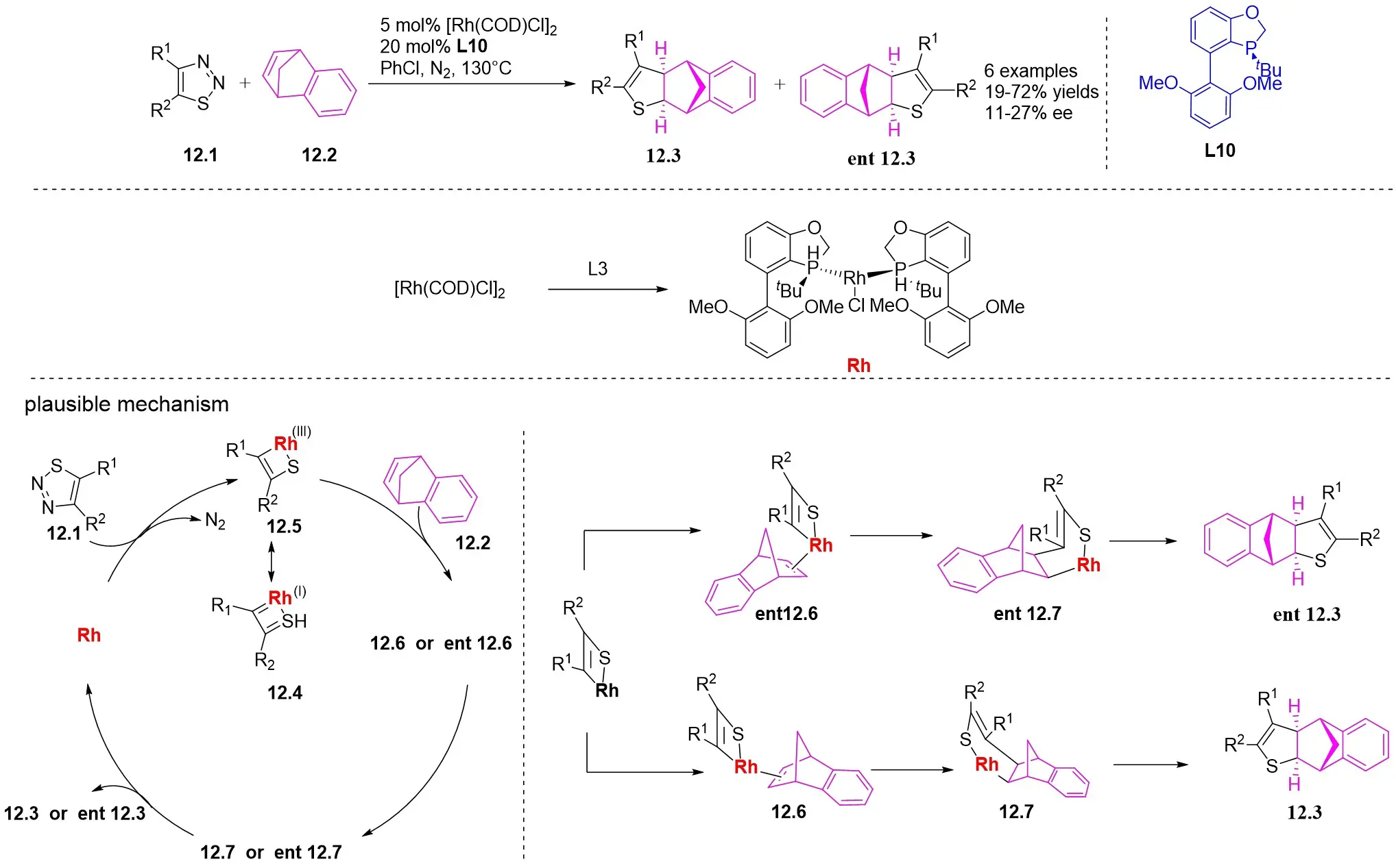 In 2023, a study presented a method for the (3 + 2) transcyclization of 1,2,3-thiadiazoles 12.1 with bicycloalkenes 12.2, employing [Rh(COD)Cl]2 as the catalyst and P-chiral monodentate phosphide as the ligand to yield polycyclic dihydrothiophenes with four newly formed stereocenters (Figure 12)[45]. This study confirmed that monodentate phosphine could be a beneficial ligand for facilitating the (3 + 2) transcyclization of 1,2,3-thiadiazoles. Yield and enantioselectivity were strongly influenced by the electronic characteristics of the 5-aryl group in 1,2,3-thiadiazoles. More electron-deficient 1,2,3-thiadiazoles exhibited increased yields and improved enantioselectivity, while more electron-rich ones led to lower yields and enantioselectivity. Mechanistically, the process begins with ligand exchange to form the diphosphine-coordinated Rh(I) species L2RhCl (L=L10), succeeded by catalytic denitrogenation oxidative addition to produce α-sulfurylcarbenes 12.4, proposed to exist as a resonance structure of rhodium ring 12.5. The planar quaternion ring is orthogonal to the P–Rh–P plane. Exchange of bicycloalkene 12.2 from its less exposed side to the enantiomeric plane of 12.5 results in the formation of complexes 12.6 and ent-12.6. Transferring the C=C bond into the Rh–C bond in 12.6 and ent-12.6 generates the respective four-membered rhodium rings 12.7 and ent-12.7, which subsequently undergo reductive elimination to yield the (3 + 2) transcyclization products 12.3 and ent-12.3 and regenerate the catalyst.