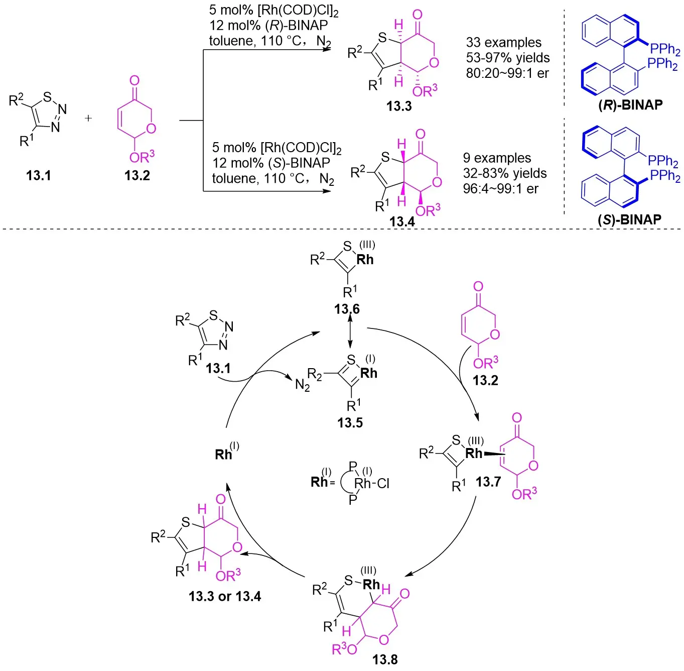 In 2024, they published findings on a significantly enantioselective, diastereoselective, and regioselective (3 + 2) cyclization of azimatowicz rearrangement products utilizing nucleophilic thioacylRh(I)-carbene within a Rh(I)/BINAP catalytic system (Figure 13)[46]. This procedure resulted in the formation of bicyclic dihydrothiophenes containing various functional groups, three contiguous chiral centers, and five prochiral centers, achieving yields as high as 97% and enantiomeric ratios of up to 99:1. This developed technique provided a novel route for synthesizing structurally diverse and highly enantiomerically pure bicyclic dihydrothiophenes, serving as sulfur analogs of natural iridoids. Additionally, the outstanding compatibility of this reaction laid the groundwork for the structural alteration of enantiomeric natural products and pharmaceutical compounds. Mechanistically, the initial step involved the reaction of 1,2,3-thiadiazoles 13.1 with (R)-BINAP-RhCl through denitrooxidative addition to generate a quaternary thioacyl Rh(I)-carbene species (13.5↔13.6). Subsequent anticoordination with 13.2 occurred from the opposite face of the exocyclic acetoxy group, leading to the migration of the carbon-carbon double bond into the Rh–C bond, forming a bicyclic 1-thia-2-rhodium heterocyclic ring 13.8 with all stereocenters in place. The reductive elimination process yielded the enantiomerically pure product 13.3 or 13.4 and regenerated the catalyst.