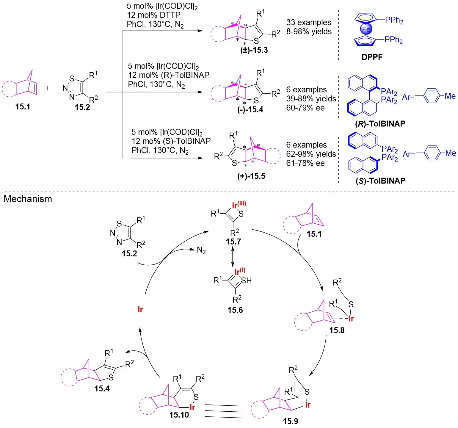 In 2022, Yang and colleagues investigated the denitrogenation (3 + 2) cyclization of 1,2,3-thiadiazoles 15.2 with polysubstituted olefins 15.1 (Figure 15)[24]. Initially, disubstituted, trisubstituted, and tetrasubstituted linear olefins failed to react with either terminal or internal counterparts. The steric hindrance of the C=C plane was thought to impede its interaction with the α-sulfurylrhodium carbene intermediate. To address this steric deactivation, the researchers developed a strategy by employing cyclic olefins in place of linear ones. Experimental findings revealed that norbornene, as a bicycloolefin with a ring strain of 19.2 kcal/mol, displayed significant reactivity in the targeted (3 + 2) cross-modulation. This was attributed to the alleviation of ring strain, which served as the primary driving force behind the reaction. Enantioselective and diastereoselective (3 + 2) cyclization reactions catalyzed by iridium were observed in the reaction between 1,2,3-thiadiazoles and cyclohexene derivatives. Employing DPPF as a ligand led to the specific generation of the sole diastereomer 2,3-dihydrothiophene 15.3. Replacing achiral DPPF ligands with chiral (R)-TolBINAP and (S)-TolBINAP ligands facilitated the asymmetric synthesis of optically active 2,3-dihydrothiophenes 15.4 and 15.5. A range of 1,2,3-thiadiazoles demonstrated high reactivity, with the exceptions of 5-(4-iodophenyl), 5-(4-methoxyphenyl), and 5-(4-nitrophenyl) 1,2,3-thiadiazoles. Cyclopentadiene-fused imides exhibited lower reactivity compared to bicycloalkenes, and their reactivity showed some sensitivity to N-aryls, likely due to subtle electronic differences. This study investigates the mechanism using (R)-TolBINAP. The reaction of 1,2,3-thiadiazoles 15.2 with phosphine-linked iridium catalysts formed a quaternary species that demonstrates resonance between sulfuryl Ir(I) carbene 15.6 and cyclometallated Ir(III) complex 15.7. The external coordination of bicycloolefin 15.1, taking into account its steric disparity relative to the enantiomeric plane of 15.7, led to the formation of complex 15.8. The subsequent migration of the C=C bond promoted the insertion of the Ir-C bond, resulting in reductive elimination and the formation of (3 + 2) straddle products, thus regenerating the catalyst. When (S)-TolBINAP was employed, coordination occurred from the right side, resulting in the enantioselective formation of the final product 15.5.