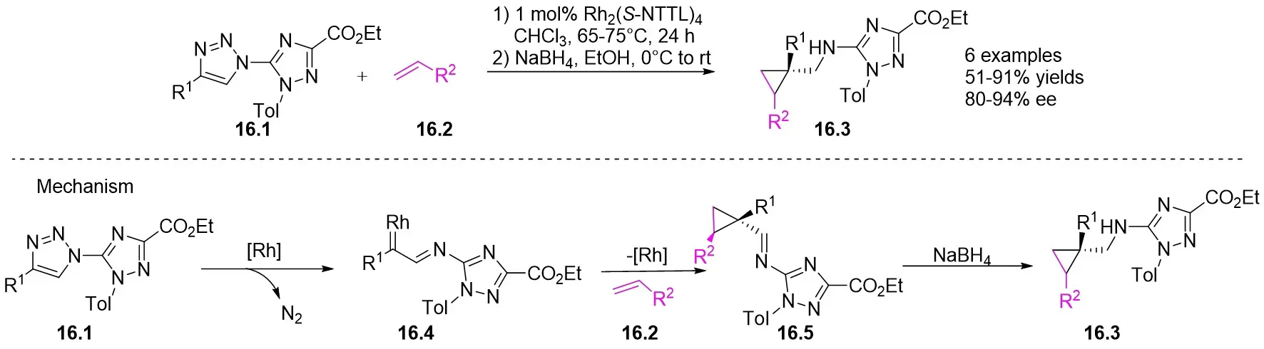 In 2011, Fokin and Zibinsky introduced a Rh(II)-catalyzed method for synthesizing cyclopropanes 16.3 from N-(1,2,4-triazolyl)-substituted 1,2,3-triazoles 16.1 and olefins 16.2 in CHCl3 using Rh2(S-NTTL)4 at 65 °C (Figure 16)[58]. The process involved the subsequent reduction of the resulting imine with NaBH4 to produce cyclopropane with notable enantioselectivity and diastereoselectivity. Triazoles 16.1 featuring an N-1 carbon substituent were observed to promote the ring-chain isomerization of triazoles. The proposed reaction mechanism involves the easy formation of azavinyl carbene 16.4 from 1,2,4-triazolyl-1,2,3-triazolethyl esters. This carbene can subsequently react with olefins to form imine 16.5, which can then be reduced with NaBH4 to afford the final product.