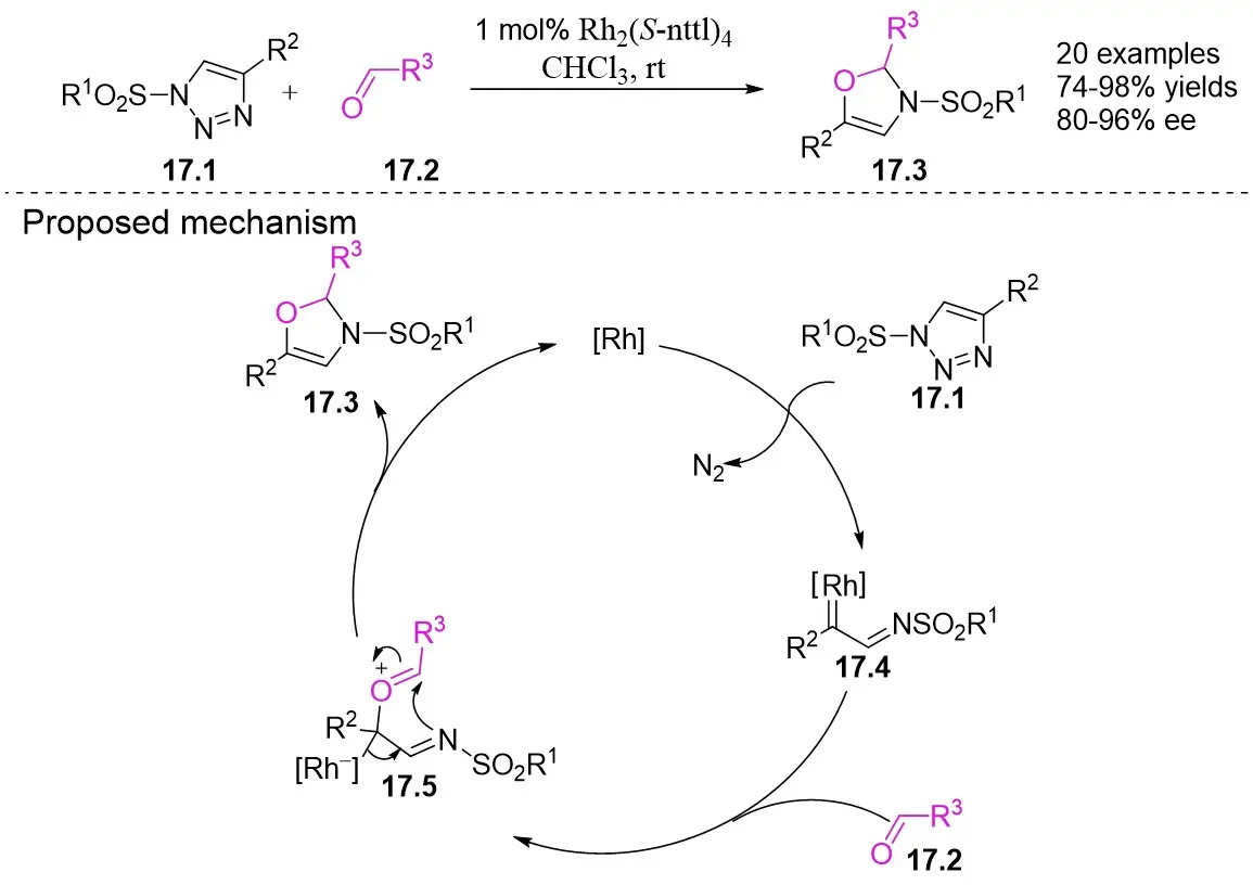 In 2012, they described a rhodium(II)-catalyzed denitrogenation process that utilized 1-sulfonyl-1,2,3-triazoles 17.1 and aldehydes 17.2 to produce 4-oxazolidine derivatives 17.3 (Figure 17)[59]. The highest enantioselectivity was attained through the reaction of 1-methanesulfonyl-1,2,3-triazoles 17.1 with a Rh2(S-nttl)4 catalyst at ambient temperature. Prolonged reaction times were observed to markedly decrease the enantioselectivity of the majority of products. Additionally, imines derived from aliphatic aldehydes underwent irreversible ring opening at the C-O bond of aminoaldehydes under high temperatures, followed by β-proton elimination. The denitrogenation of triazoles 17.1 by the catalyst produces carbene 17.4, which then reacts with the carbonyl to generate imine salt 17.5. This intermediate undergoes cyclization to form oxazoline 17.3.