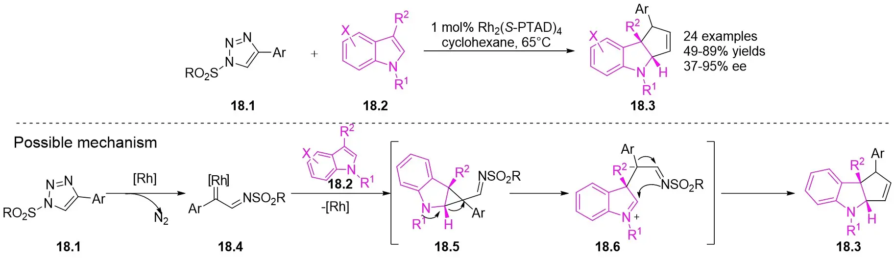 In 2013, Davies and Spangler reported a [3+2] cycloaddition process involving 4-aryl-1-sulfonyl-1,2,3-triazoles 18.1 and C3-substituted indoles 18.2 in cyclohexane at 65°C with Rh2(S-PTAD)4 as the catalyst (Figure 18)[60]. The reaction produced pyrroloindolines 18.3 with notable enantioselectivity and satisfactory yields. The research showed that performing the cyclization in a nonpolar hydrocarbon solvent led to exceptional conversion rates and enantiomeric control. The reaction exhibited sensitivity to steric hindrance, resulting in the inability to obtain the target products when utilizing larger 1-sulfonyl-1,2,3-triazoles. However, the target product can be achieved when R1 was hydrogen or allyl; larger volumes or electron-withdrawing groups in R1 hinder product formation. Substituting the indole aryl ring significantly increased the yield of the desired product. The authors proposed a plausible pathway for product formation, which includes the initial cyclopropanation of the C2–C3 bond of the indoles, followed by ring opening and complexation of the strained cyclopropylindoline intermediate, ultimately leading to the formation of the observed pyrrolindolines.