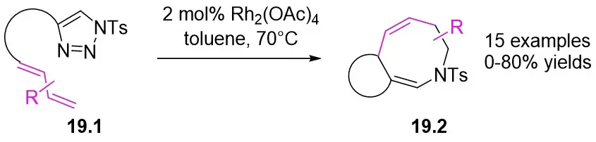 In 2014, Shen and Xu introduced a Rh2(OAc)4 catalyst for diverse dienyltriazoles 19.1, utilizing a carbene-cyclopropanation-aza-cope rearrangement cascade to produce dihydroazepanes 19.2 (Figure 19)[61]. This process involved strain relief of the three-membered ring, with substitution at position 7 providing exceptional diastereoselectivity. Diene triazoles substituted with 1-phenyl groups can be effectively converted into the respective dihydroazepanes with high yields. However, the addition of a second substituent (such as a methyl group at position 4 of the diene structure) could potentially have a negative impact on the reaction outcomes. Minor modifications to the reactive dienetriazole resulted in intricate reaction mixtures without any predominant products being isolated.