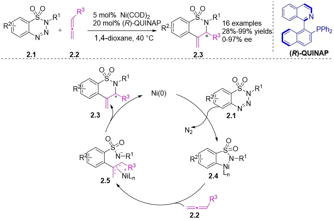 In 2010, Murakami et al. introduced a nickel-catalyzed method for enantioselective cyclization using 1,2,3,4-benzothiazinones 2.1 and allenes 2.2 to synthesize 1,2,3,4-benzothiazine-1,1(2H)-dioxide derivatives 2.3 (Figure 2)[30]. Most 1,2,3,4-benzothiazinones 2.1 and enynes 2.2, featuring primary or secondary alkyl groups as R1 and electron-donating or electron-withdrawing substituents as R2, can undergo denitrocyclization to yield 1,2,3,4-benzothiazine-1,1(2H)-dioxide derivatives 2.3 with high yield and enantioselectivity. Additionally, alkylalkynes with siloxy, benzyloxy, and N-phthalimide groups were also compatible with the reaction, albeit resulting in slightly lower enantiomeric purity. The reaction utilized Ni(COD)2 as a catalyst and (R)-QUINAP as a ligand to optimize enantioselectivity. The proposed cyclization mechanism includes: 1) oxidative addition of nickel(0) to the N-N bond of 1,2,3,4-benzothiazinone 2.1, 2) formation of a five-membered azacyclic ring 2.4 via nitrogen elimination from benzothiazinone, 3) allene insertion to form intermediate 2.5, and 4) allylamidation at the more substituted carbon for product generation and regeneration of the nickel(0).