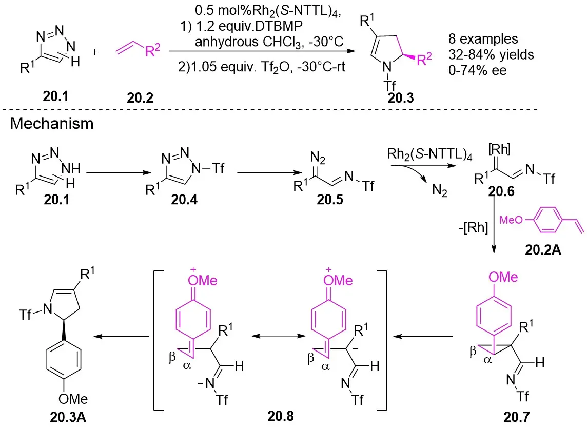 In 2014, Fokin’s team published a study on the one-pot asymmetric synthesis of 2,3-dihydropyrroles 20.3 using trifluorotriazoles 20.1 and olefins 23.2 under rhodium catalysis (Figure 20)[62]. The study found that the choice of catalyst influenced the enantioselectivity of the reaction, with Rh2(S-NTTL)4 demonstrating the highest enantioselectivity at 72% ee. Enantioselectivity was significantly affected by both the electronic and steric effects of the substrate, exhibiting a cumulative influence. The reaction mechanism involves the interaction of triazoles 20.1 with the Rh2(S-NTTL)4 catalyst to form rhodium carbene 20.6, which then reacts with electron-rich olefins to produce cyclopropylaldimine 20.7. The strong electron-withdrawing effect of trifluoromethanesulfonic acid, along with the electron-donating effect of the methoxy group, facilitates the cleavage of the cyclopropane ring and the formation of the stable diionic intermediate 20.8, which subsequently transforms into 2,3-dihydropyrroles 20.3A. In this mechanism, the chiral rhodium catalysts exert stereocontrol over the final product by influencing the enantioselectivity of the intermediate cyclopropane. Subsequent rearrangements lead to a decrease in the enantiomeric excess of the final product, the degree of which is influenced by the relative rates of Cα–Cβ bond rotation and the ring closure of open-chain intermediate 20.8.