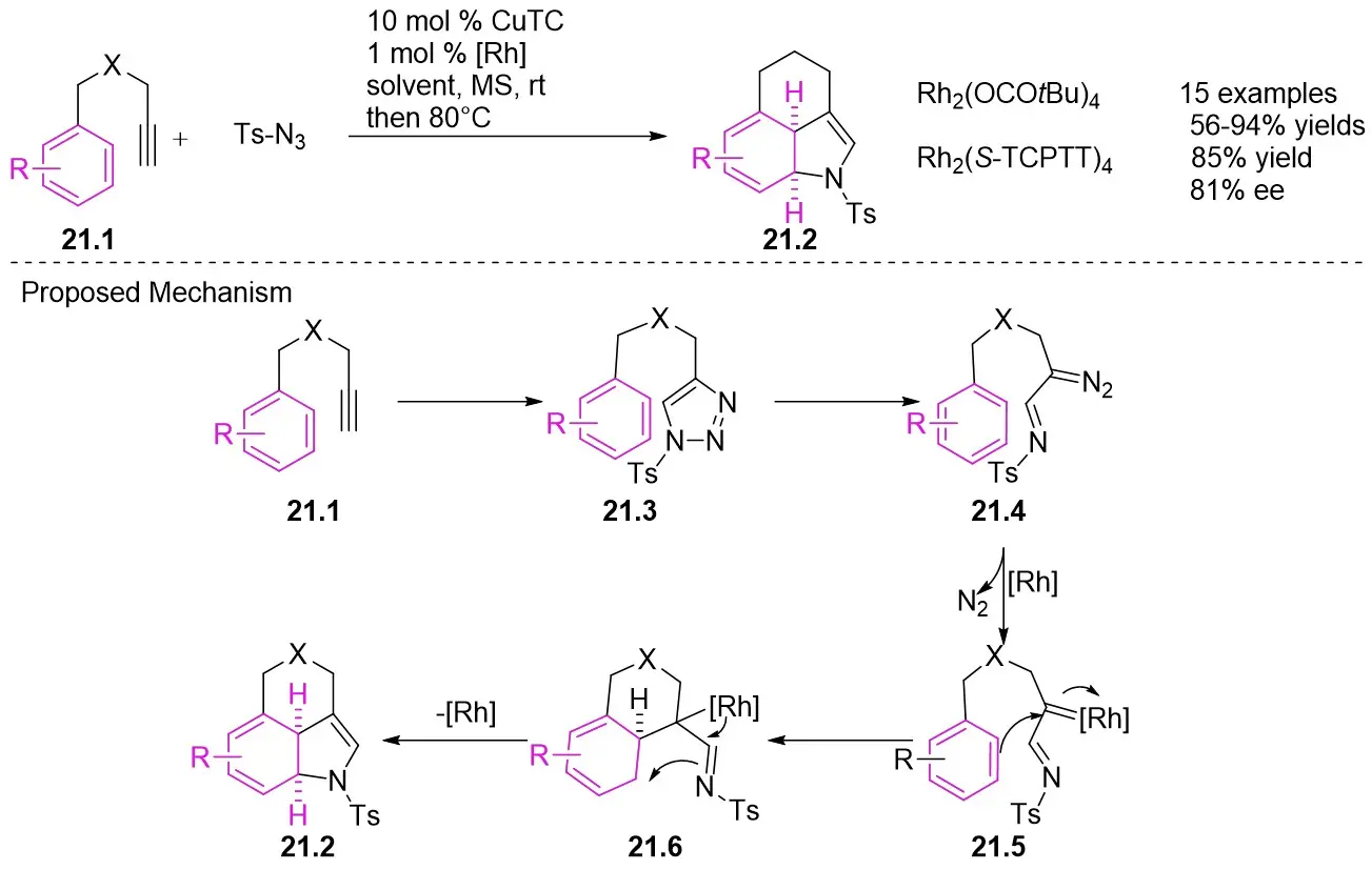 In 2014, Murakami, Miura and Funakoshi presented a rhodium-catalyzed intramolecular dearomatizing [3+2] cyclization converting 4-(3-arylpropyl)-1,2,3-triazoles into 3,4-fused indoles 21.2 using basic 5-aryl-1-ynes 21.1 in a one-pot synthesis (Figure 21)[63]. The reaction mixture was initially stirred at room temperature for 12 hours, resulting in the conversion to triazoles. Subsequently, the mixture was stirred at 80 °C for 3 hours, leading to the isolation of the products in high yield. A significant enantioselective induction (81% ee) was noted with the utilization of the chiral rhodium(II) complex Rh2(S-TCPTTL)4. The seamless one-pot process demonstrated minimal interference between the reagents and catalysts necessary for individual steps. The reaction mechanism involves the initial reaction of alkynes 21.1 with azide to generate triazoles 21.3, which undergo partial reversible isomerization into α-diazimine 21.4, subsequently reacting with rhodium(II) to liberate molecular nitrogen, forming α-iminorhodium carbene 21.5. The electrophilic carbene carbon of 21.5 facilitates an intramolecular attack on the benzene ring, forming diionic intermediate 21.6. Anionic rhodium releases bonding electrons, leading to cyclization at the imino nitrogen to produce the desired products 21.2.