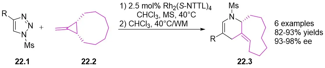 78. Parr BT, Davies HML. Rhodium-catalyzed tandem cyclopropanation/cope rearrangement of 4-alkenyl-1-sulfonyl-1,2,3-triazoles with dienes. Angew Chem. 2013;52(38):10044-10047.[DOI]