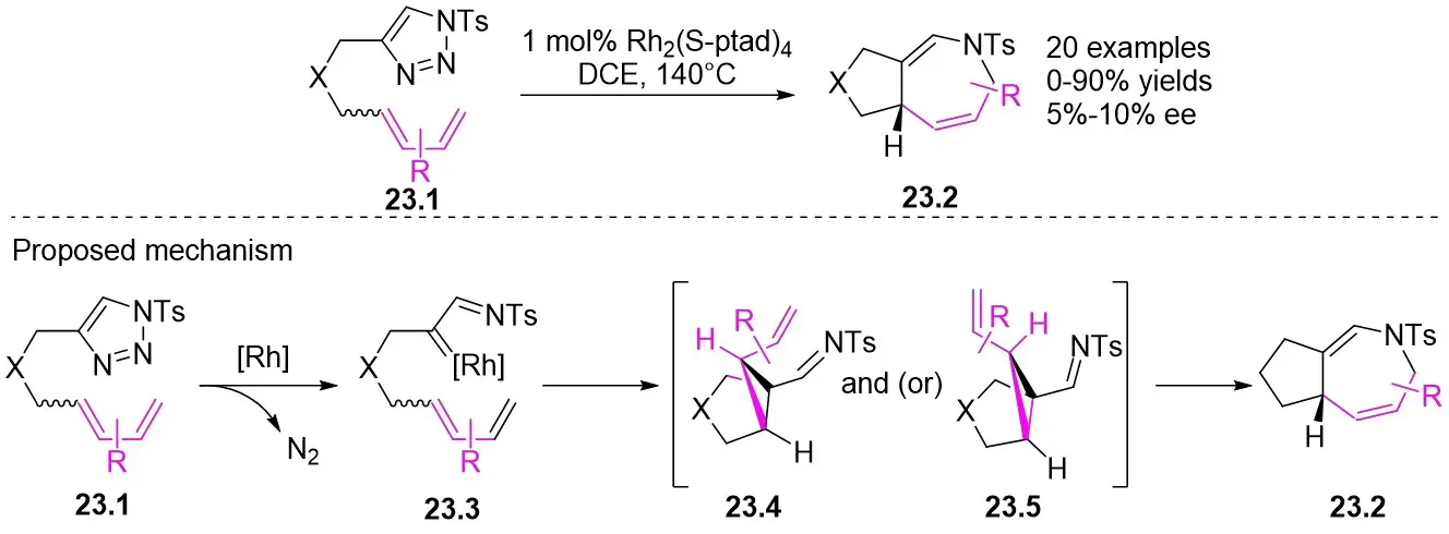 In 2015, Tang and co-workers devised a Rh2(S-ptad)4-catalyzed intramolecular [4+3] cycloaddition method using diverse dienyltriazoles 23.1 to produce fused 2,5-dihydroazepines 23.2 (Figure 23)[65]. Dialkenyl triazoles bearing aryl substituents and various linking groups were effectively transformed into the respective dihydroazepanes with satisfactory yields. However, 1,1,4-trialkenyl triazoles did not yield the anticipated [4+3] products. Regrettably, this reaction only resulted in low ee values ranging from 5% to 10%. The reaction mechanism involves the formation of Rh(II)-iminocarbene 23.3 from dienetriazole in the presence of Rh catalyst, followed by its initial [2+1] cycloaddition to yield 23.4 (from the E isomer) and/or 23.5 (from the Z isomer). Subsequently, 23.4 and/or 23.5 can be transformed into azepane 23.2 via the aza-cope rearrangement.