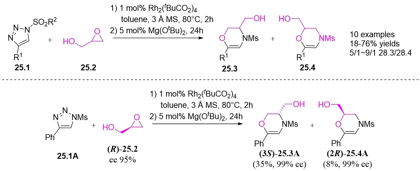 67. Ko YO, Jeon HJ, Jung DJ, Kim UB, Lee SG. Rh(II)/mg(otBu)2-catalyzed tandem one-pot synthesis of 1,4-oxazepines and 1,4-oxazines from N-sulfonyl-1,2,3-triazoles and glycidols. Org Lett. 2016;18(24):6432-6435.[DOI]
