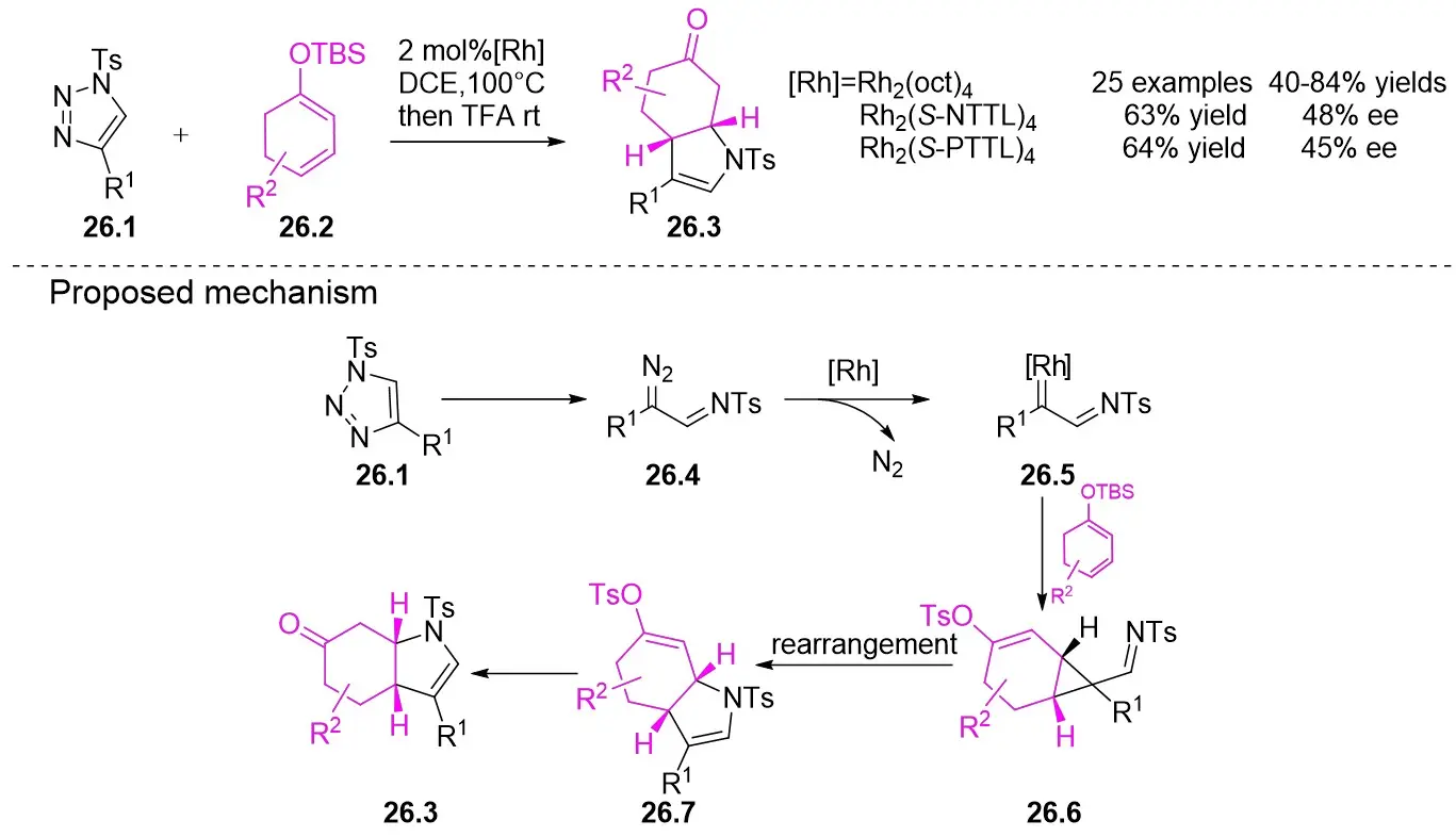 ![]() | Intermolecular AnnulationTs-N3 | Rh2(OCOtBu)4orRh2(S-TCPTTL)4 | ![]() | [63] |