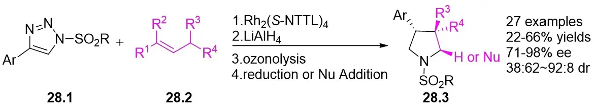 62. Kwok SW, Zhang L, Grimster NP, Fokin VV. Catalytic asymmetric transannulation of NH-1,2,3-triazoles with olefins. Angew Chem. 2014;53(13):3452-3456.[DOI]