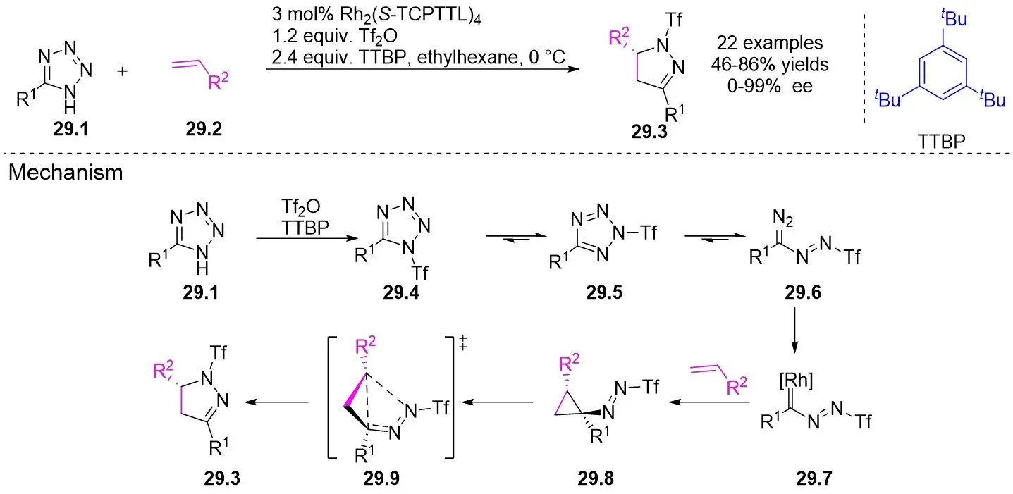 71. Nakamuro T, Hagiwara K, Miura T, Murakami M. Enantioselective denitrogenative annulation of 1H-tetrazoles with styrenes catalyzed by rhodium. Angew Chem. 2018;57(19):5497-5500.[DOI]