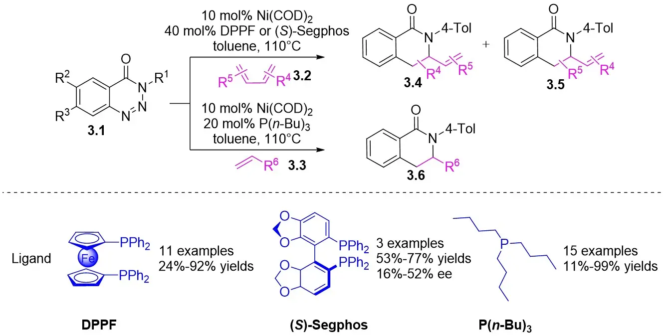 In the same year, Murakami and colleagues detailed a process in which 1,2,3-benzotriazin-4(3H)-ones 3.1 react with 1,3-dienes 3.2 and alkenes 3.3 in the presence of nickel(0)/phosphine complexes, yielding a variety of 3,4-dihydroisoquinoline-1(2H)-ones (Figure 3)[31]. Specifically, they examined the reaction of 3.1 with 1,3-dienes (3.2, 2 equiv.) in tetrahydrofuran (THF) at 60 °C utilizing in-situ-generated nickel(0) catalysts derived from Ni(COD)2 and PMe3. Investigations into chiral phosphine ligands revealed enhanced yield and enantioselectivity with ligands such as (S)-Segphos. However, the enantioselectivity was noted to be suboptimal. The proposed mechanism for this nickel-catalyzed cyclization bears close resemblance to the one described for the nickel-catalyzed cyclization of benzotriazinones 2.1 with allenes 2.2.