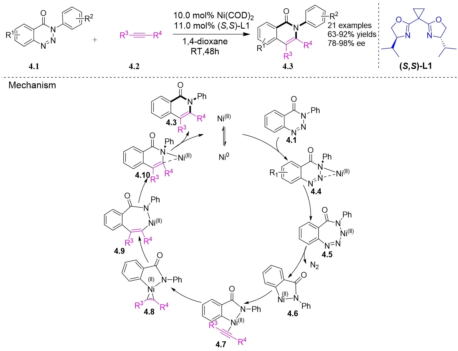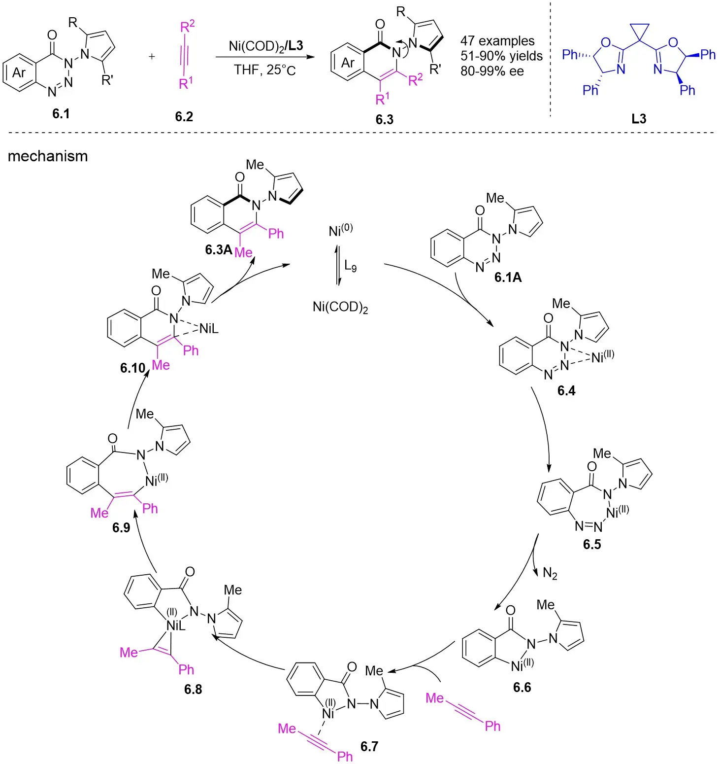 In 2024, Liu and colleagues reported the first discovery that 1,2,3-benzotriazones 6.1 and internal alkynes 6.2 undergo oxidative addition to form N–N diastereomeric isoquinolinone derivatives substituted at the 2-position under nickel catalysis (Figure 6)[34]. They determined that an in situ generated chiral Ni(0) catalyst using Ni(COD)2 and L3 in THF at 25 °C was optimal for the reaction of benzotriazones with alkynes in terms of yield, enantioselectivity, and regioselectivity. Various asymmetric alkynes and substituents were found to be universally applicable, yielding the corresponding N–N isomers with excellent yields (65-94%) and high enantioselectivities (80-99%), all being single regioisomers. The reaction involves the conversion of 6.1 to 6.4 under specific conditions. Subsequently, 6.4 transforms into the nickelacycle species 6.5. N2 extrusion occurs through 6.5, followed by the coordination of alkynes 6.2 to give 6.7. Migratory insertion via 6.8 leads to the formation of intermediate 6.9, which then undergoes reductive elimination to yield 6.10. The catalytic cycle is completed with the interchange between substrate 6.1 and product 6.3, initiating the next reaction.