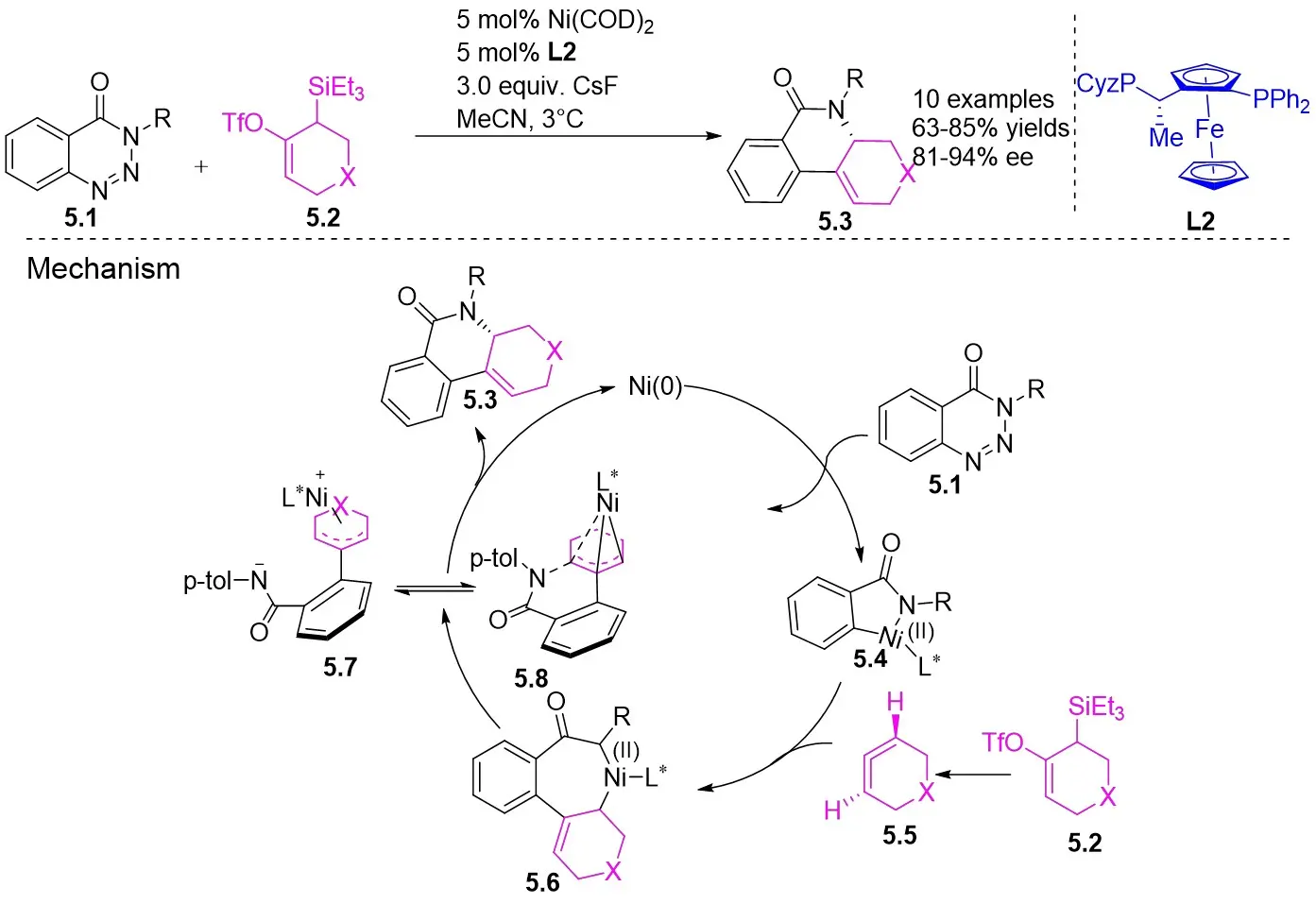 In 2020, Garg and Houk developed a denitrogenation strategy to cyclize phenyltriazinones 5.1 with acetylene precursors 5.2, resulting in chiral tricyclic compounds 5.3 (Figure 5)[33]. Initially, they investigated racemic variants by reacting different benzotriazinones with cyclic olefins at 35 °C using Ni(COD)2 as a precatalyst, 1,1’-bis(diphenylphosphino)ferrocene (DPPF) as a ligand, and cesium fluoride as a fluoride source in acetonitrile, achieving high-yield racemic products that showcased the broad applicability of the method. Subsequent utilization of the L2 chiral ligand led to a highly enantioselective product with excellent yield. The catalytic mechanism involved the rapid and irreversible oxidative addition of benzotriazinones, leading to the formation of metal ring 5.4, followed by olefin insertion to generate 5.6, ultimately producing the final product and regenerating the catalytic cycle.