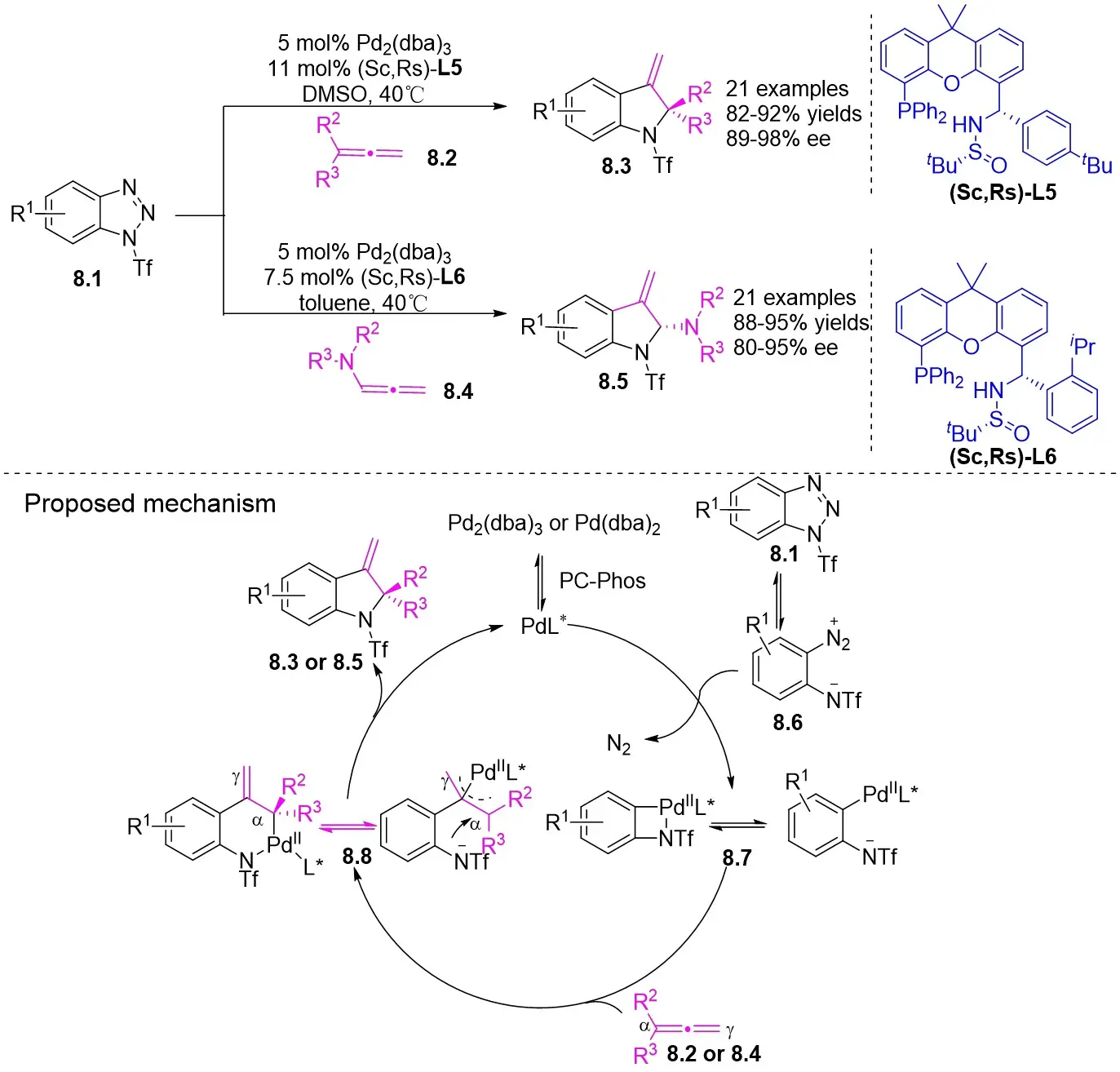 In 2019, Zhang et al. first reported the enantioselective denitrogenative cyclization of benzotriazoles 8.1 catalyzed by Pd/PC-Phos (Figure 8)[22]. Benzotriazoles 8.1 reacted with alkenes 8.4 at 40 °C in the presence of catalytic amounts of Pd2(dba)3 and (Sc,Rs)-L5, using dimethyl sulfoxide (DMSO) as the solvent, to yield 3-methylindololines 8.3. The reaction showed tolerance to both electron-donating and electron-withdrawing groups on the aryl unit of the allenes, leading to high yields between 89% and 97% and enantiomeric excesses of 89% to 98%. For expanding this method in synthesizing 2-substituted 3-methylindololine derivatives, N-acrylamides 8.4 were used as the cycloaddition partner in conjunction with (Sc,Rs)-L6 as the chiral ligand. The corresponding indololine products were obtained in yields ranging from 88% to 95%. Importantly, numerous sensitive functional groups were shown to be compatible with these optimized reaction conditions. Benzotriazoles 8.1 undergo chain isomerization to give rise to 8.6. Insertion of C–Pd bond of alkynenes 8.2 or alkynamines 8.4, a p-allyl palladium complex 8.7 can be formed. After an allyl substitution reaction, a cyclization product 8.3 or 8.5 will be generated, and a palladium catalyst will be regenerated.