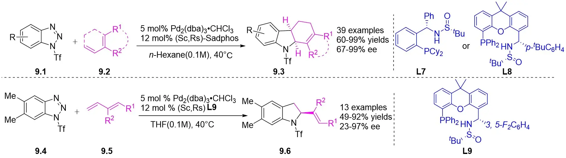 In 2021, the team conducted a chemically selective, regio- and enantioselective denitrocycloaddition Heck/Tsuji-Trost reaction of benzotriazoles 9.1 with cyclic and acyclic 1,3-dienes, employing palladium catalysis and chiral sulfonamide phosphine ligands (Figure 9)[39]. This method offered a straightforward pathway for producing a range of substituted hexahydrocarbazoles and indolines. Benzotriazoles 9.1 was treated with cycloene-1,3-dienes 9.2 using Pd2(dba)3·CHCl3 as a catalyst, leading to the production of hexahydrocarbazoles 9.3. The specific products formed was influenced by the choice of chiral sulfonamide phosphine ligand in the reaction. Treatment with phosphine ligand L7 in n-hexane solvent yielded hexahydrocarbazoles. Conversely, the use of phosphine ligand L8 resulted in the formation of the corresponding enantiomer. The reaction shown good compatibility with benzotriazoles containing different functional groups R at various positions on the phenyl ring, as well as substituted cyclohexa-1,3-dienes, cyclohepta-1,3-dienes, and non-terminal 1,3-dienes, leading to high yields and exceptional enantioselectivity. To enhance the synthesis of indoline derivatives 9.4 and 1,3-dienes 9.5 underwent a reaction with L9 as the chiral ligand, resulting in the production of the respective indolines with satisfactory yields.