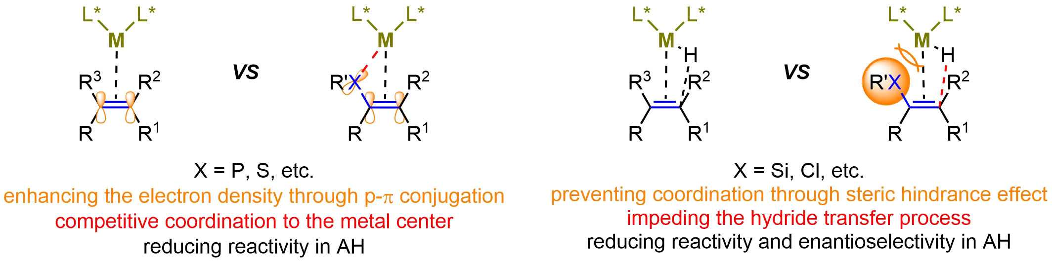 Figure 1. The difficulties in catalytic asymmetric hydrogenation of heteroatom-substituted alkenes. Created in ChemDraw. AH: asymmetric hydrogenation.