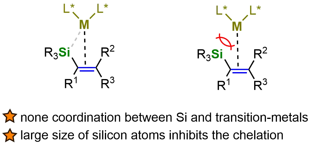 While various methods for preparing chiral organosilanes have been developed, there remains a continuous demand for more efficient and innovative strategies to synthesize these compounds[55-58]. One particularly promising avenue is the transition-metal-catalyzed asymmetric hydrogenation of vinyl silanes, which has emerged as an effective and atom-economical approach. This method enables the direct, straightforward, and highly selective formation of chiral organosilanes, thereby offering significant advantages in asymmetric synthesis. The ability to achieve high enantioselectivity, coupled with the simplicity of the reaction, makes this strategy a powerful tool in both academic research and industrial applications. Specifically, although silyl groups are widely used as functional groups in synthetic chemistry, the coordination of silicon atoms in silyl-substituted alkenes with transition-metal catalysts is generally not observed. The large size of silicon atoms inhibits the chelation of transition metals with silyl-substituted alkenes, making their asymmetric hydrogenation particularly challenging (Figure 3).