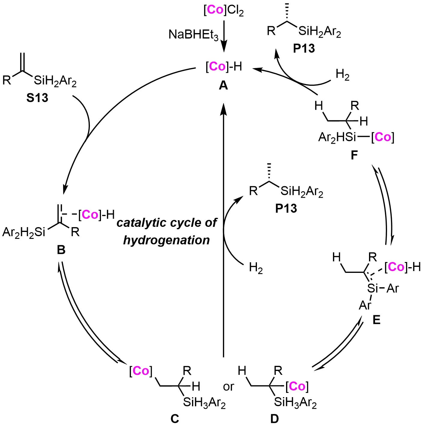 The proposed mechanism for the cobalt-catalyzed hydrogenation of vinyl silanes is illustrated in Figure 5. The reaction begins with the coordination of the vinyl silane (S13) to the cobalt species (A), followed by alkene insertion into the cobalt-hydrogen bond to form cobalt-carbon intermediates (C and D). Both intermediates are capable of reacting with H₂ to yield the desired product and regenerate the cobalt-hydride species. β-Hydrogen elimination from intermediate D may lead to the formation of species E, which can undergo rapid insertion of the C=Si double bond, generating the cobalt silyl species (F). This species (F) is then quenched by H₂ to release the final product (P13) and regenerate the cobalt-hydride species (A). Importantly, most of the reaction steps are reversible, providing a dynamic catalytic cycle. While this mechanistic framework rationalizes the reaction pathway, further studies are required to fully elucidate the enantioselective process. This cobalt-catalyzed methodology constitutes a significant advance in the asymmetric synthesis of chiral silanes, combining broad functional group tolerance with operational simplicity—attributes particularly valuable for complex molecule synthesis.
