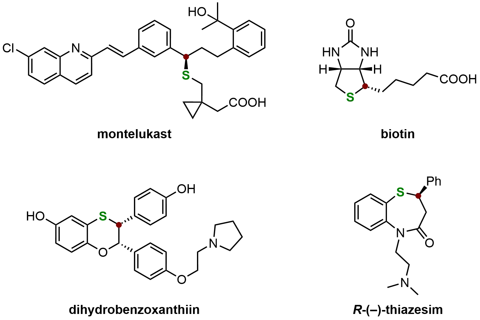 As illustrated in Figure 7, several notable compounds exemplify the utility of chiral organosulfides. Montelukast, a potent cysteinyl leukotriene (cysLT) receptor antagonist, is widely used for asthma treatment. Biotin (vitamin B7 or H), an essential component of the B-vitamin complex, participates in multiple metabolic processes, including fat, carbohydrate, and amino acid metabolism. Dihydrobenzoxanthiin, a novel α-selective estrogen receptor modulator, exhibits significant antagonist activity, while thiazesim demonstrates antidepressant properties, collectively underscoring the therapeutic value of chiral sulfides[71].