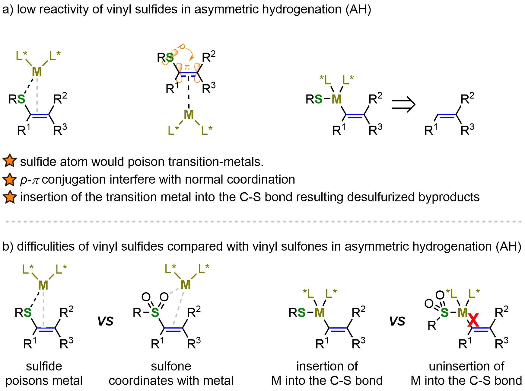 Given the biological and synthetic significance of chiral organosulfides, extensive research has focused on developing efficient asymmetric catalytic methods for their synthesis. Transition-metal-catalyzed asymmetric hydrogenation of thioesters has proven particularly effective, offering a direct, atom-economical route to chiral organosulfides, thus highlighting its importance in asymmetric synthesis. However, vinyl sulfide hydrogenation presents unique challenges. The strong p–π conjugation in vinyl sulfides, coupled with potential sulfur-metal coordination, can disrupt normal vinyl-catalyst binding. These interactions may induce unwanted metal insertion into the C–S bond, leading to desulfurized byproducts. Such side reactions significantly complicate both vinyl group activation and the subsequent hydrogenation (Figure 8a).