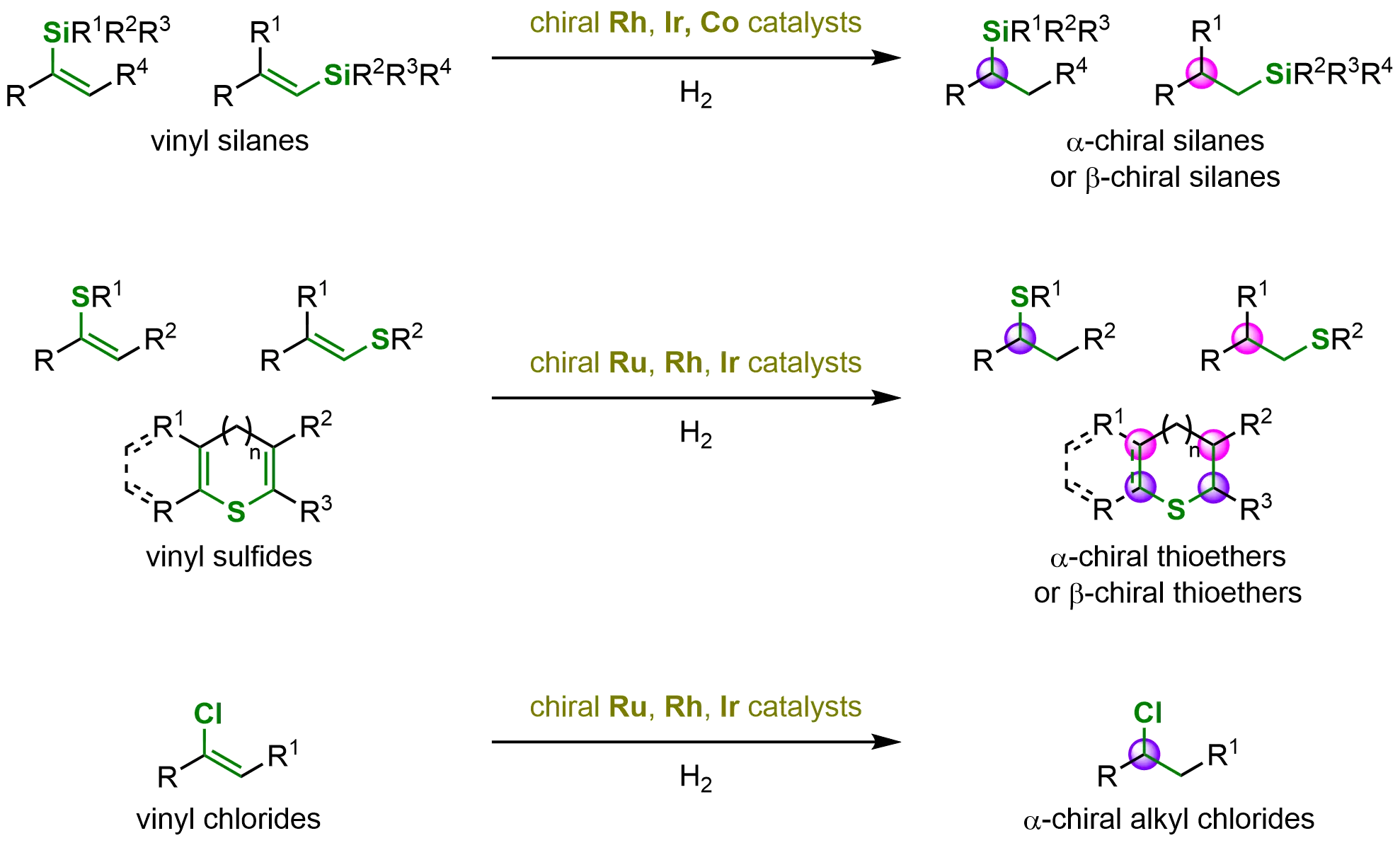 This review highlights significant advances in this rapidly developing field, demonstrating how asymmetric hydrogenation of Si-, S-, and Cl-substituted alkenes provides an efficient strategy for accessing enantioenriched Si-, S-, and Cl-functionalized compounds (Scheme 1). We systematically summarize key progress in the hydrogenation of C=C bonds containing these heteroatomic substituents. To offer a comprehensive survey of synthetic methodologies for constructing diverse Si-, S-, and Cl-containing scaffolds, the transformations are categorized based on the different heteroatom-substituted alkenes and the various transition-metal catalysts.