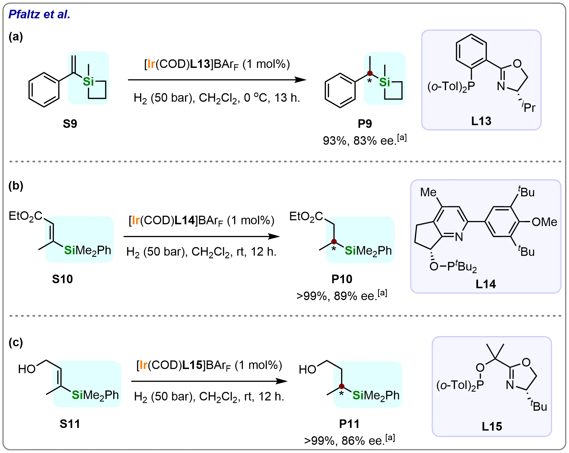 The researchers further evaluated challenging substrates under optimized conditions (Scheme 10)[66]. Vinyl siletane was hydrogenated using the Ir-PHOX complex (L13), affording product (P9) in 93% conversion and 83% ee. The system also accommodated functionalized vinyl silanes, including α,β-unsaturated esters (S10), which were reduced with 100% conversion and 89% ee using pyridine-phosphinite ligand (L14). Similarly, an allylic alcohol substrate (S11) achieved complete conversion with 86% ee when catalyzed by a Neo-PHOX-derived complex (L15). These results demonstrate the Ir-PHOX system’s versatility in processing diverse functionalized substrates.