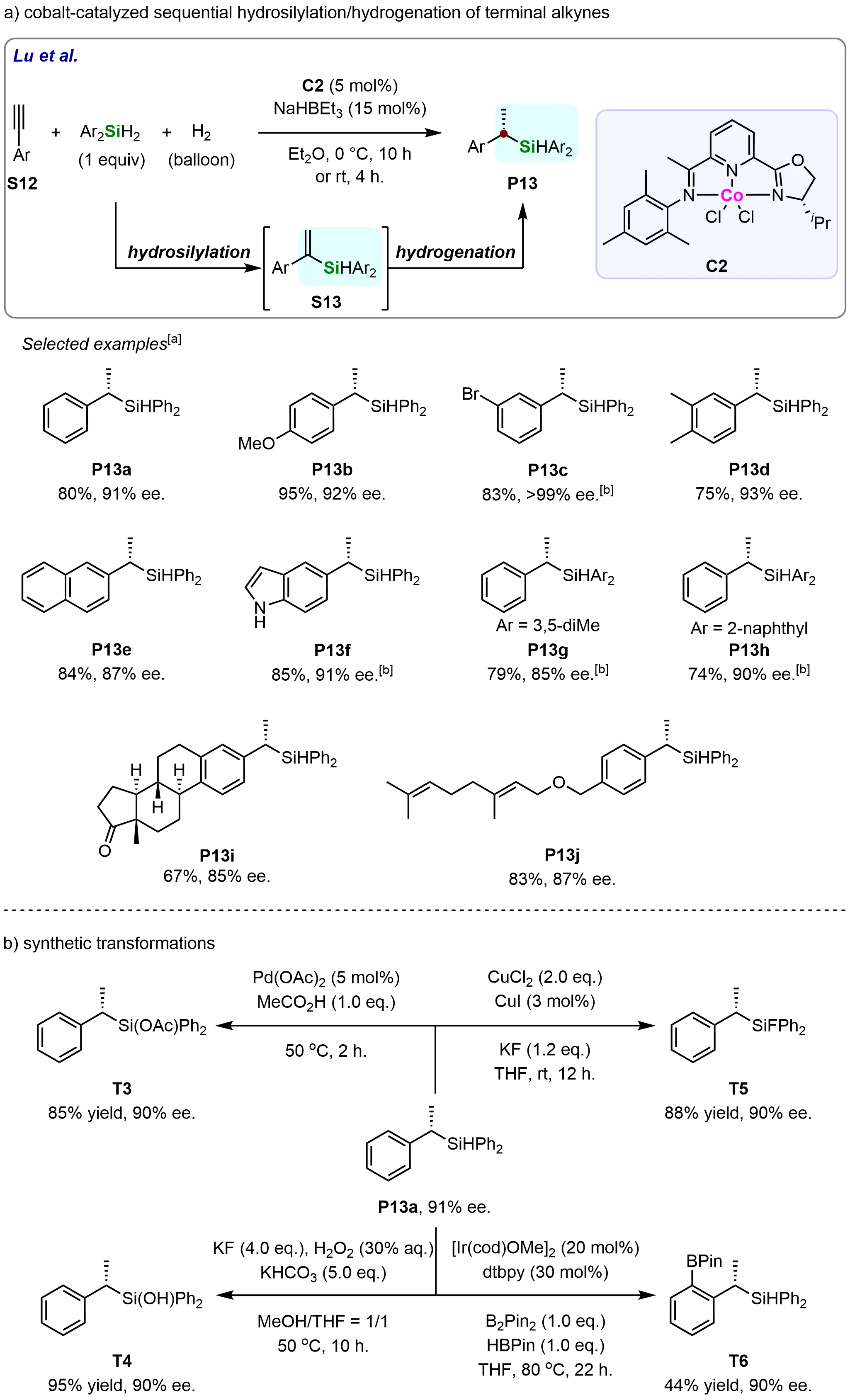 In 2017, Guo et al. developed a cobalt-catalyzed sequential hydrosilylation/hydrogenation of alkynes that proceeds with high regio- and enantioselectivity (Scheme 11)[67]. This methodology employs commercially available alkynes, silanes, and H2 to efficiently construct chiral silanes. The reaction exhibited broad substrate scope, delivering products in 74-95% yield with 85% to > 99% ee. The cobalt precatalyst (C2) proved crucial for achieving high enantioselectivity. Notably, the system accommodated 5-indolyl groups, yielding (P13f) with 85% yield and 91% ee. The protocol was further applicable to alkynes in bioactive scaffolds (P13i and P13j), demonstrating late-stage functionalization potential (Scheme 11a). Ketones, alkenes, and ethers remained intact under the reaction conditions, highlighting the method’s functional group tolerance.