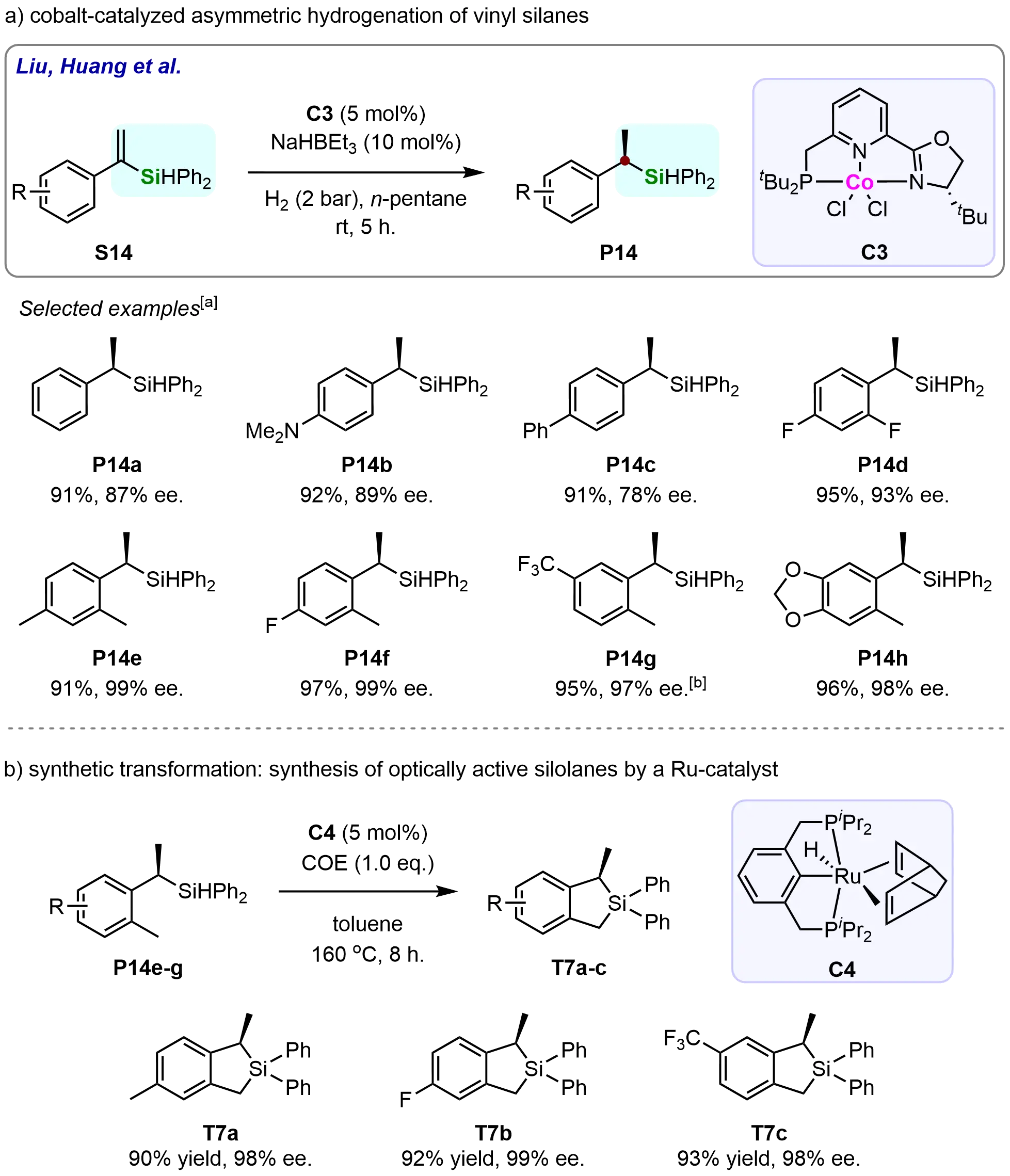 Scheme 12. Cobalt-catalyzed asymmetric hydrogenation of vinyl silanes with a phosphine-pyridine-oxazoline ligand. Created in ChemDraw. [a]: Isolated yield was recorded; [b]: Reaction was performed with H2 (4 bar).