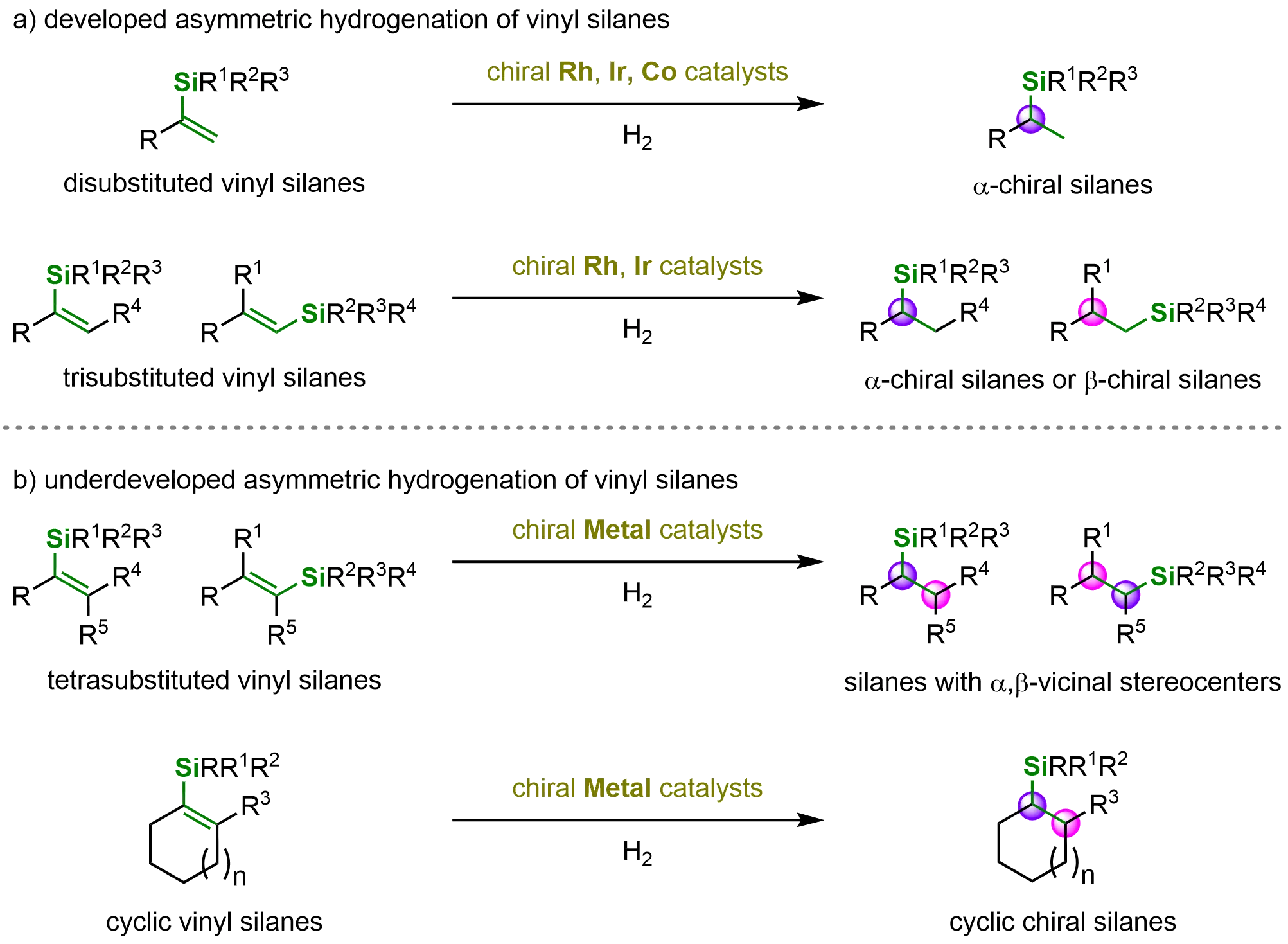 Scheme 13. Developed and underdeveloped metal-catalyzed asymmetric hydrogenation of vinyl silanes. Created in ChemDraw.