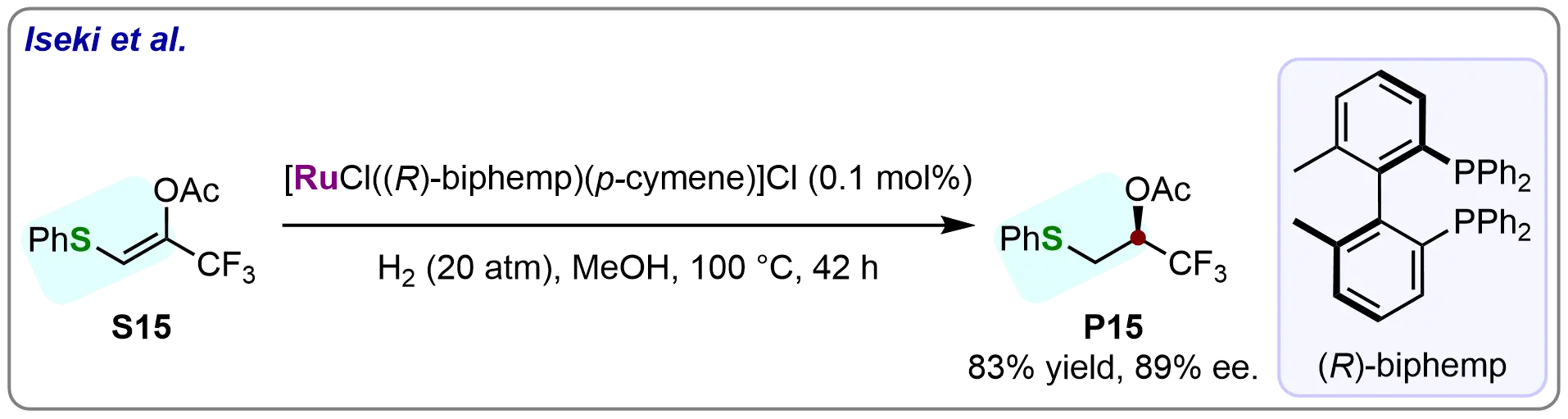 In 2000, Iseki and co-workers successfully employed a Ru-(R)-biphemp catalyst for the asymmetric hydrogenation of a vinyl sulfide (S15) bearing a phenylthiol moiety at the olefinic carbon. This reaction afforded the desired hydrogenated product (P15) in 83% yield with 89% ee (Scheme 15)[77]. This pioneering work marked a significant advance in asymmetric hydrogenation by demonstrating the feasibility of vinyl sulfide hydrogenation. The phenylthiol substituent provided novel insights into achievable stereocontrol, highlighting ruthenium-catalyzed transformations’ potential for selective vinyl sulfide functionalization. Iseki’s study established foundational principles for vinyl sulfide asymmetric hydrogenation while opening avenues for more efficient syntheses of sulfur-containing chiral compounds.