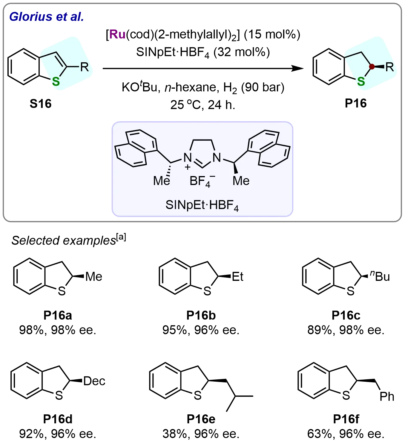 To explore the scope of this methodology, the authors initially investigated the hydrogenation of various 2-alkyl substituted benzothiophenes under optimized reaction conditions. The corresponding 2,3-dihydrobenzothiophenes were obtained with exceptional enantioselectivities, as exemplified in Scheme 16. In particular, several 2-alkyl substituted benzothiophenes (S16a-S16d) were successfully hydrogenated, yielding the corresponding products (P16a-P16d) in good to high yields and with outstanding enantioselectivities (ranging from 96% to 98%). While 2-isobutyl- (S16e) and 2-benzylbenzothiophene (S16f) gave modest yields (45-62%), both maintained > 95% ee, confirming the catalyst’s robust stereocontrol across structurally diverse substrates.
