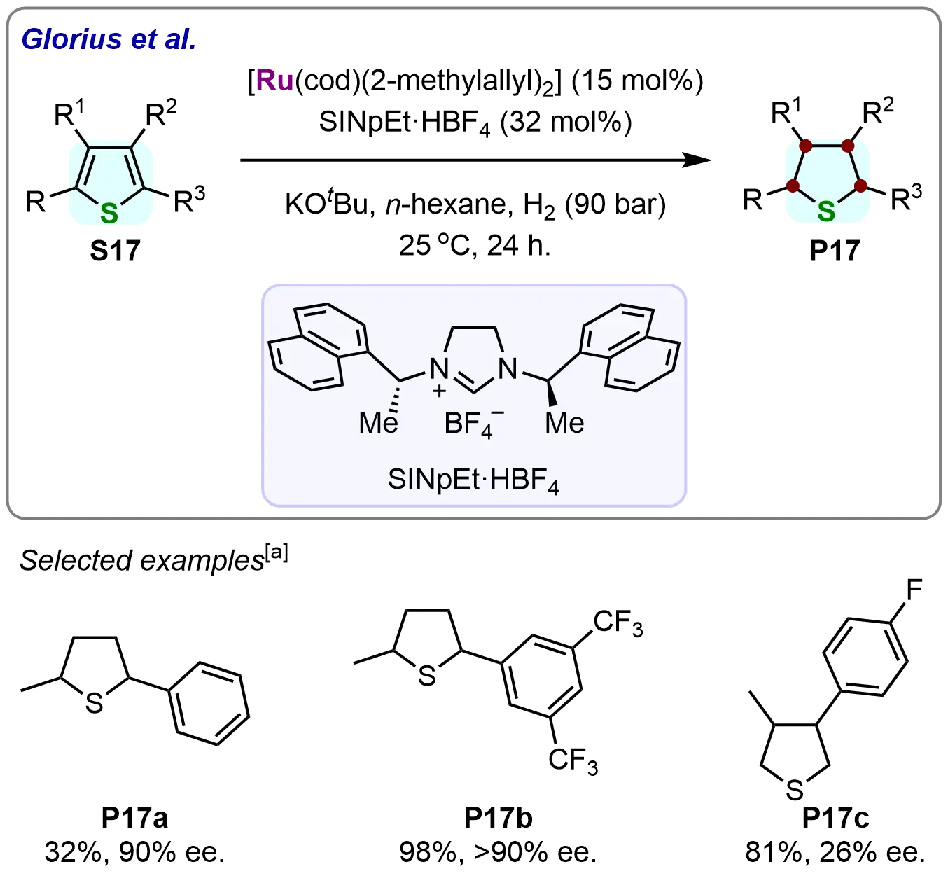 The methodology was further extended to disubstituted thiophenes under identical optimized conditions, efficiently yielding tetrahydrothiophene derivatives (Scheme 17). This work represents the first successful homogeneous hydrogenation of disubstituted thiophenes, confirming the Ru–NHC catalyst’s versatility. While phenyl-substituted thiophene (S17a) gave modest yields, electron-deficient substrates like 2-fluorothiophene (S17b) achieved excellent conversions, with both cases exhibiting > 95:5 er and complete cis-diastereoselectivity. The protocol also accommodated regioisomers (e.g., 3,4-disubstituted S17c), albeit with lower selectivity (63:37 er). This study establishes Ru–NHC systems as highly efficient and selective catalysts for asymmetric hydrogenation of sulfur heterocycles across diverse substitution patterns.