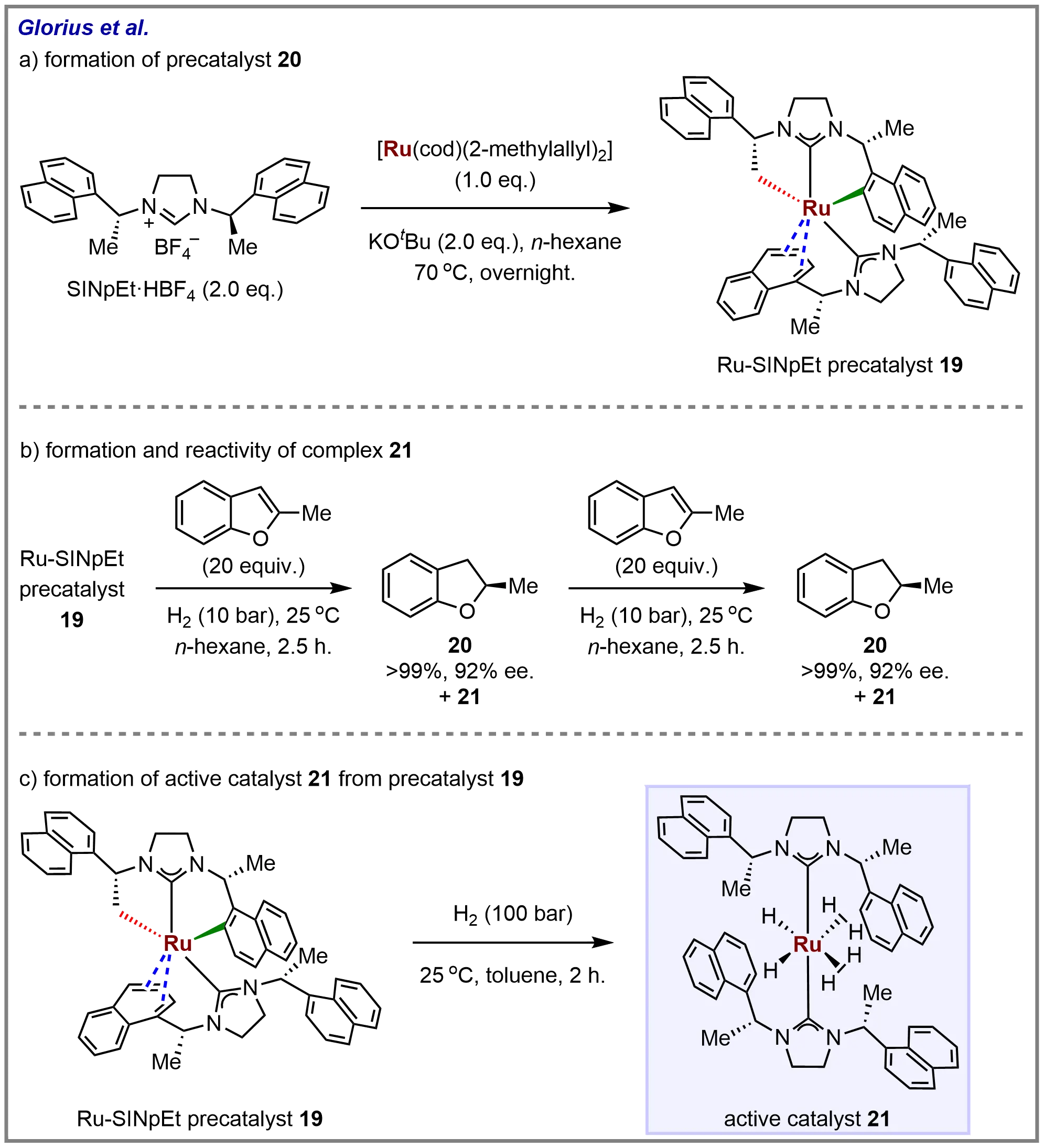 Paul et al. have developed a highly effective and versatile chiral Ru-NHC catalyst for the enantioselective hydrogenation of heteroaromatic compounds bearing sulfur atoms. In all cases, the NHC ligand SINpEt (N,N'-bis(naphthylethyl)imidazolidinium-2-ylidene) demonstrated superior reaction performance, compatible with various substrate classes. Despite the catalyst’s unique reactivity profile and overall versatility, there has been limited structural and mechanistic information available regarding the Ru-SINpEt catalyst system[80]. In this study, Glorius and co-workers present the synthesis, characterization, and structural identification of precatalyst 19, featuring an unusual doubly cyclometallated NHC ligand (Scheme 19a). The hydrogenation of 2-methylbenzofuran under 10 bar H₂ was halted after 2.5 hours, and an aliquot was analyzed. A second batch of substrate was subsequently added to resume the reaction, with the catalyst retaining activity, achieving full conversion of the second batch of benzofuran with consistent enantioselectivity (Scheme 19b). Electrospray ionization mass spectrometry (ESI-MS) analysis identified complex 21 as the sole detectable species after both the first and second reactions. The researchers demonstrated that complex 21, which could be generated from precatalyst 19, serves as the active catalyst in the asymmetric hydrogenation process (Scheme 19c).