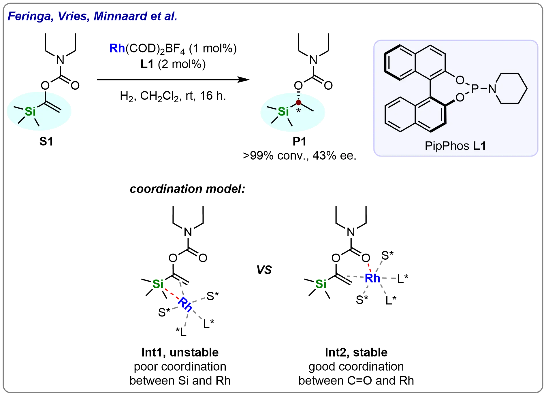 In 2005, Feringa, Vries, Minnaard, and co-workers reported the enantioselective rhodium-catalyzed hydrogenation of enol carbamates using monodentate phosphoramidites (Scheme 2)[59]. Their study demonstrated that the sterically hindered trimethylsilyl (TMS) substituted enol N,N-diethylcarbamate (S1) could be hydrogenated to full conversion under mild conditions, albeit with modest enantioselectivity (43%). The reactivity of the asymmetric hydrogenation (Int2) was significantly enhanced by the strong coordination between the carbonyl functionality and the rhodium center. In contrast, the weak silicon-rhodium interaction failed to establish an analogous coordination model (Int1). This pioneering work not only underscored the potential of phosphoramidite-ligated rhodium catalysts for the hydrogenation of challenging substrates but also opened up new avenues for exploring the catalytic asymmetric hydrogenation of silicon-substituted alkenes. Since then, this area has attracted considerable attention in both synthetic and mechanistic studies.