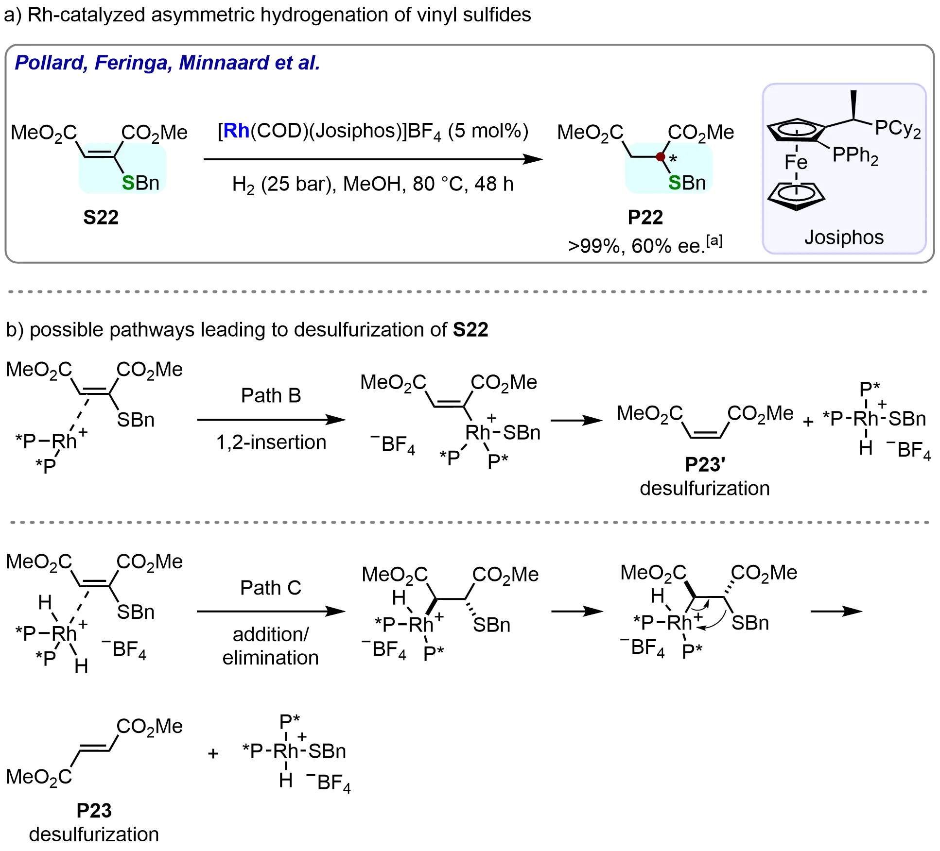 In 2007, Meindertsma et al. employed a rhodium/Josiphos catalyst system for the asymmetric hydrogenation of α-branched vinyl sulfides, efficiently affording α-stereogenic thioethers (Scheme 20a)[81]. After thorough optimization of reaction conditions, the desired hydrogenated product (P22) was obtained in full conversion with 60% enantiomeric excess (ee). This work represents a significant advancement in the asymmetric hydrogenation of sulfur-containing compounds. Notably, the formation of desulfurized byproducts (P23 and P23’) was observed, which prompted further investigation into the reaction mechanism. Control experiments elucidated the byproduct origin and provided mechanistic insights into the catalytic process. These results supported a proposed mechanistic pathway (Scheme 20b). The mechanism involves the insertion of the rhodium species into the carbon-sulfur bond of the substrate, which may lead to a desulfurization process, or alternatively, a syn-elimination of a rhodium sulfide intermediate following the addition of the rhodium hydride to the olefin. These findings advance the understanding of rhodium catalysis in sulfur-containing systems and may guide the design of improved vinyl thioether hydrogenation catalysts.