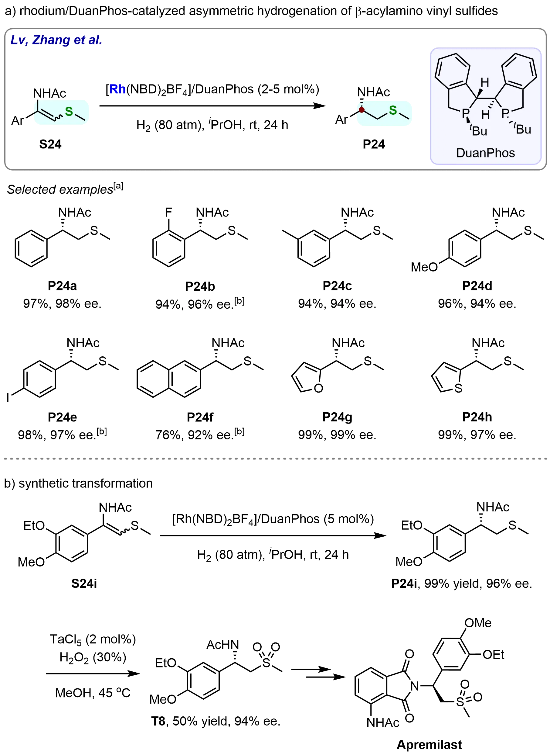 To further explore the synthetic utility of this methodology, a series of downstream derivatizations and applications were performed. As shown in Scheme 21b, the Rh-catalyzed asymmetric hydrogenation of S24i proceeded smoothly to afford the corresponding product P24i in 99% yield with 96% enantiomeric excess (ee). Subsequent oxidation of P24i with H2O2 in the presence of TaCl₅ furnished the β-acetylamino sulfone (T8) in 50% yield, without any erosion of enantiomeric purity. Notably, starting from T8, Apremilast, a drug approved by the U.S. Food and Drug Administration (FDA) in 2014 for the treatment of adult patients with active psoriatic arthritis, can be readily synthesized following reported procedures[83].