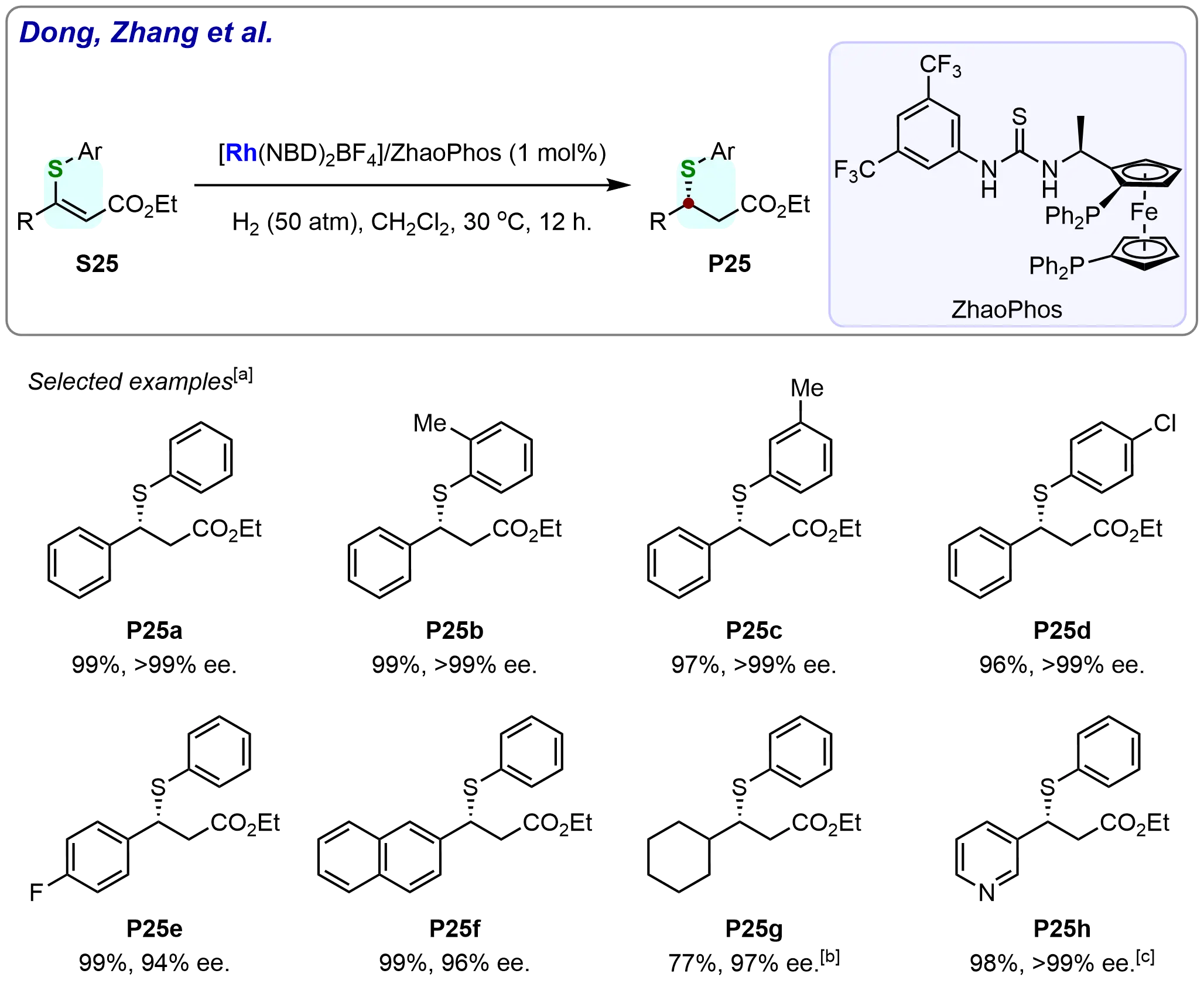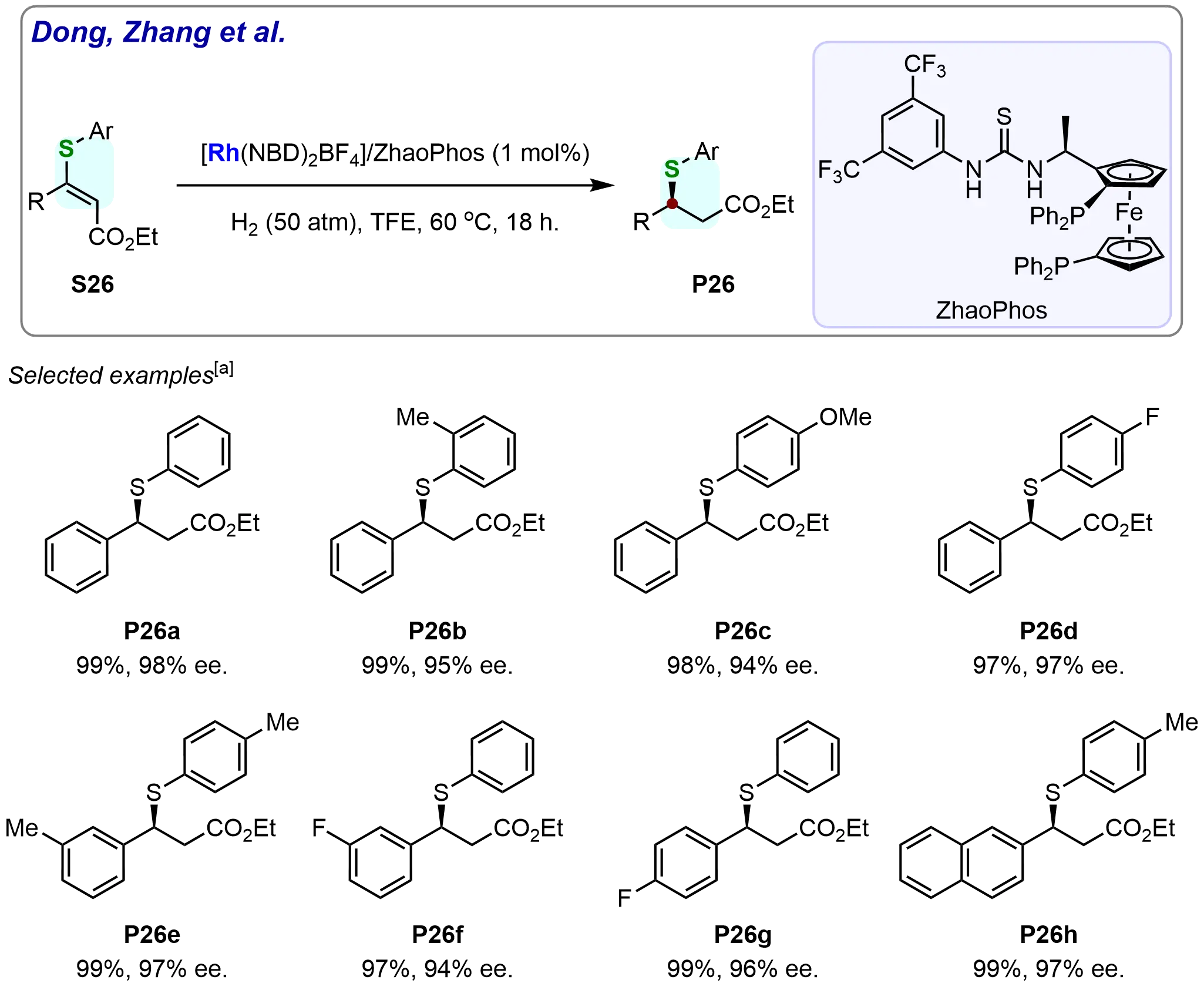 In 2018, Liu et al. developed a rhodium/ZhaoPhos-catalyzed asymmetric hydrogenation of (Z)- and (E)-β-substituted-β-thio-α,β-unsaturated esters, enabling the efficient and stereoselective synthesis of both enantiomers of ethyl β-substituted-β-thio-propanoates with excellent yields (up to 99%) and enantioselectivities (> 99% ee). This versatile method demonstrated broad substrate scope, successfully hydrogenating diverse β-thio-α,β-unsaturated esters while maintaining exceptional selectivity[84].