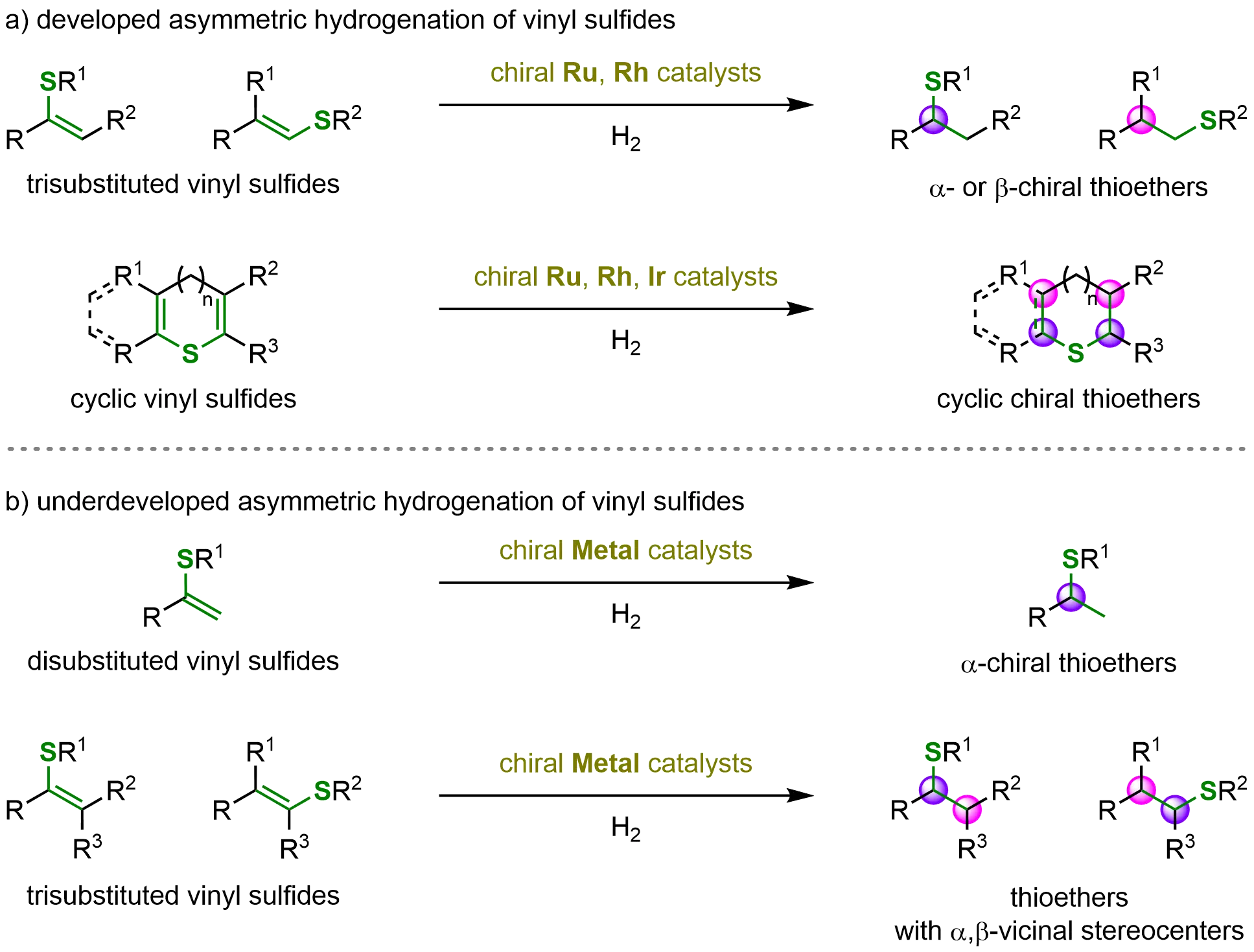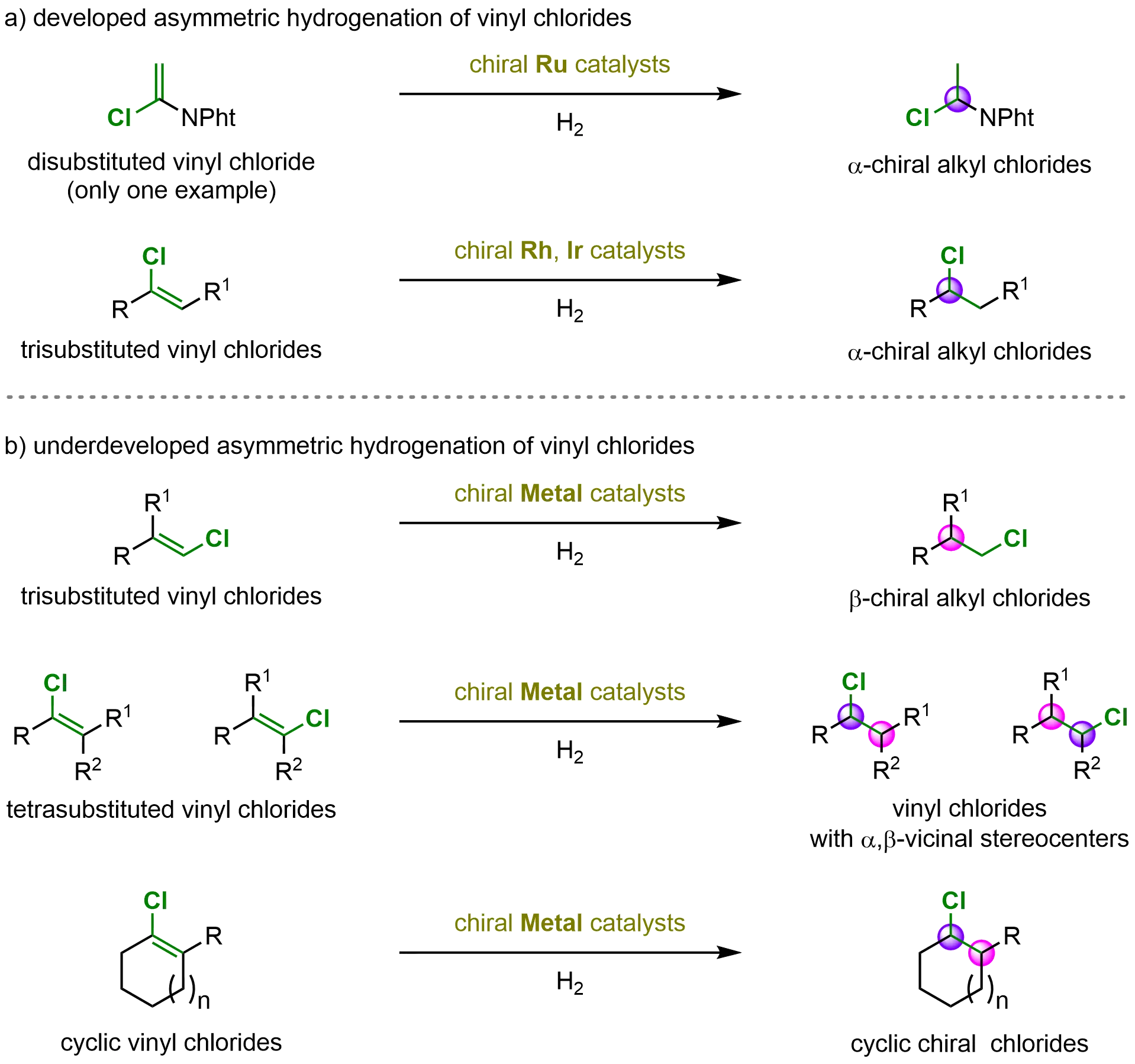 Over recent decades, significant advances have been achieved in the asymmetric hydrogenation of heteroatom-substituted alkenes. To overcome the characteristic low reactivity and modest stereoselectivity of these transformations, researchers have developed several effective strategies. These include: (1) the rational design of high-performance chiral catalysts to improve reaction efficiency, and (2) structural modifications of the alkene substrates through the introduction of electron-withdrawing groups or auxiliary coordinating moieties to enhance both reactivity and enantiocontrol. Remarkable progress has been documented for alkenes bearing various heteroatom substituents, including boron (B), nitrogen (N), oxygen (O), fluorine (F), silicon (Si), phosphorus (P), sulfur (S), and chlorine (Cl). While comprehensive reviews have covered the asymmetric hydrogenation of B-[48], N-[49], O-[9], F-[50], and P-[51]substituted alkenes, the corresponding transformations of Si-, S-, and Cl-substituted alkenes remain systematically unexplored in the review literature, to the best of our knowledge.